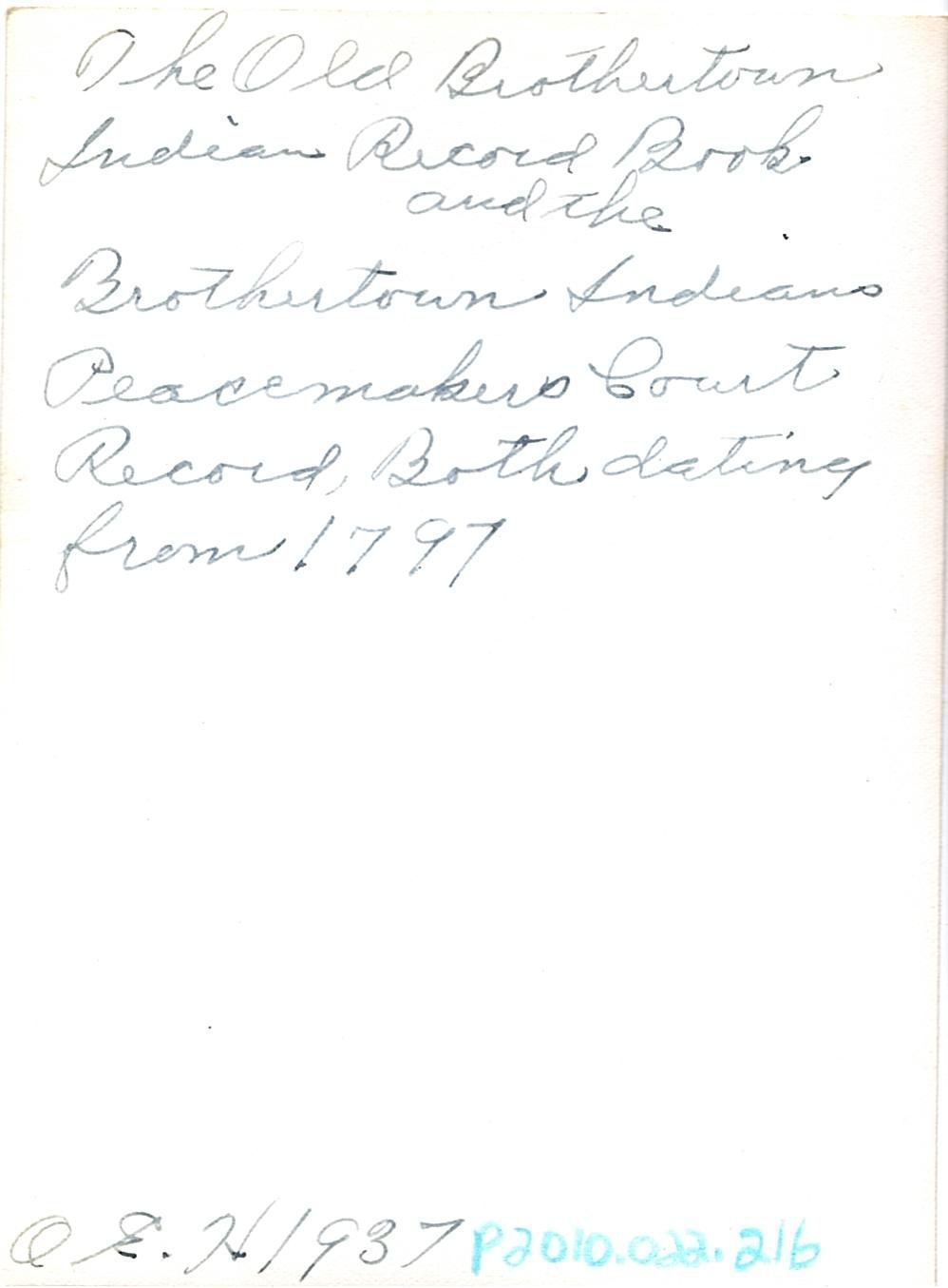 Written in black ink on the back "The Old Brothertown Indian Record Book and the Brothertown Indians Peacemakers Court Record, both dating from 1797. O.E. H. 1937".