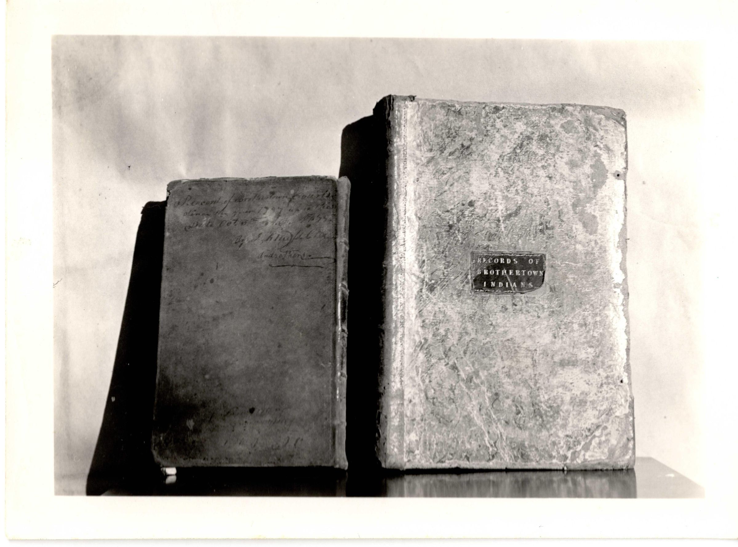 Black and white photograph of two books. The one on the left is the Record of Brothertown Courts 1797 and the right book is labeled "Records of Brothertown Indians".