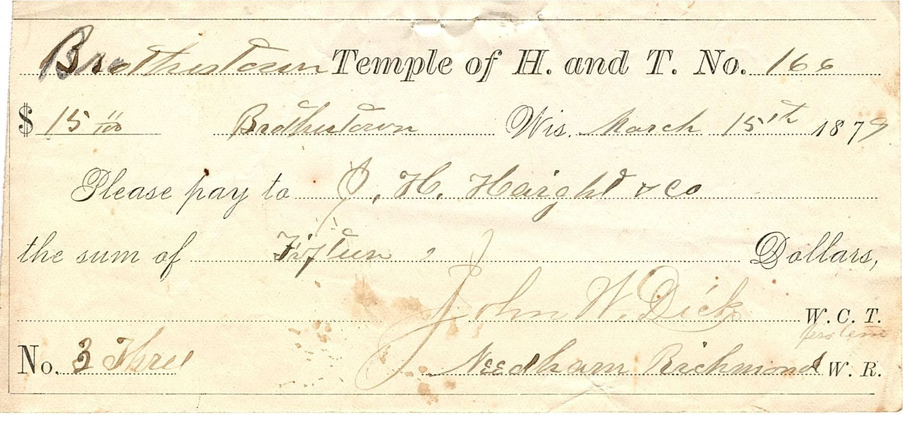 BC2010.022.885A is dated March 15, 1879 for $15.11. It is No. 3 and signed by John W. Dick and Needham Richmond.