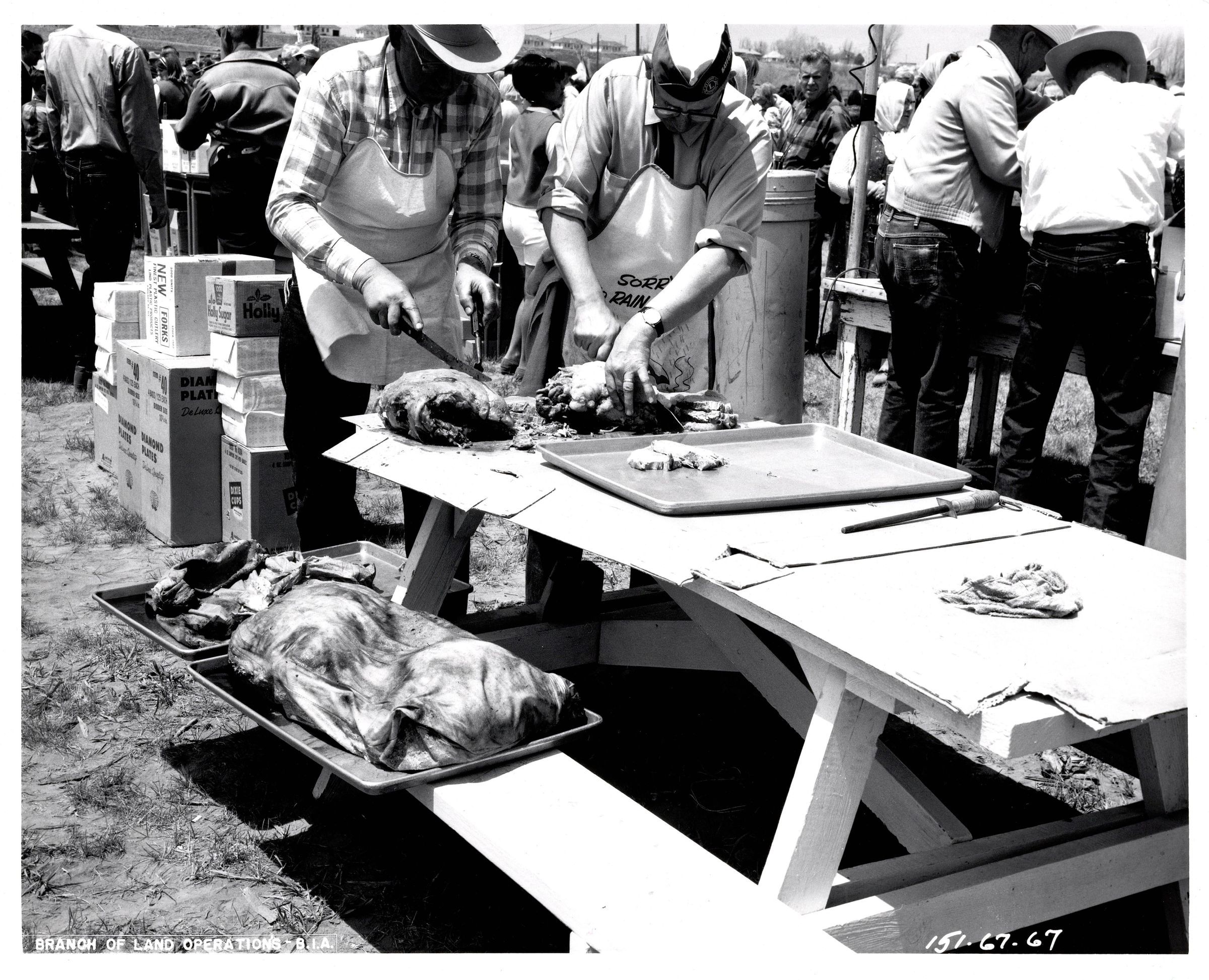 Black and white photo of two men wearing kitchen aprons and cutting something on a picnic table. There are multiple trays on the table and bench, one covered in a fabric. There is a crowd behind them.Collection