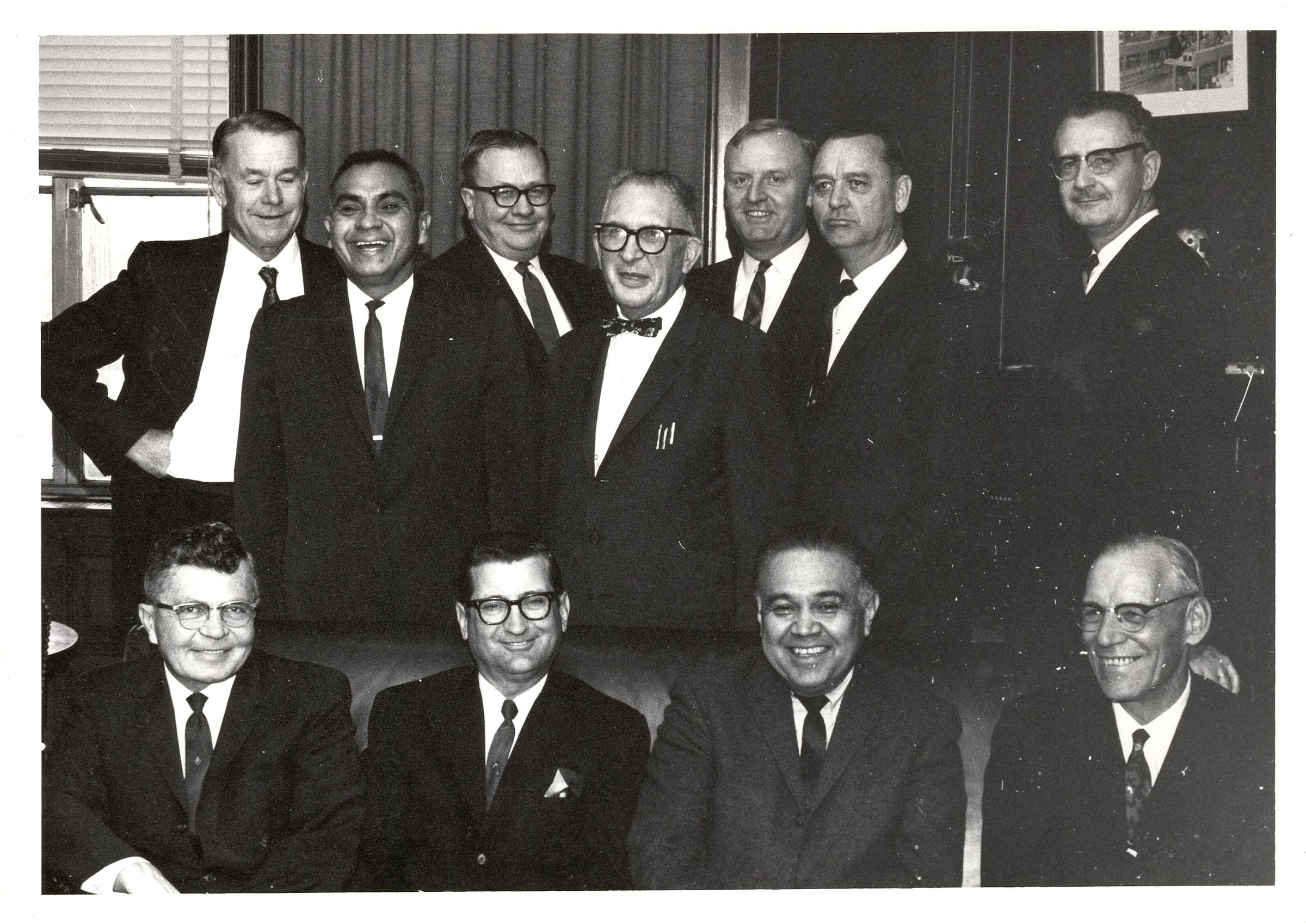 Black and white photograph of eleven (11) men, four (4) seated on a couch and seven (7) standing behind the couch. Robert Bennett is the third from the left seated.Photograph Details