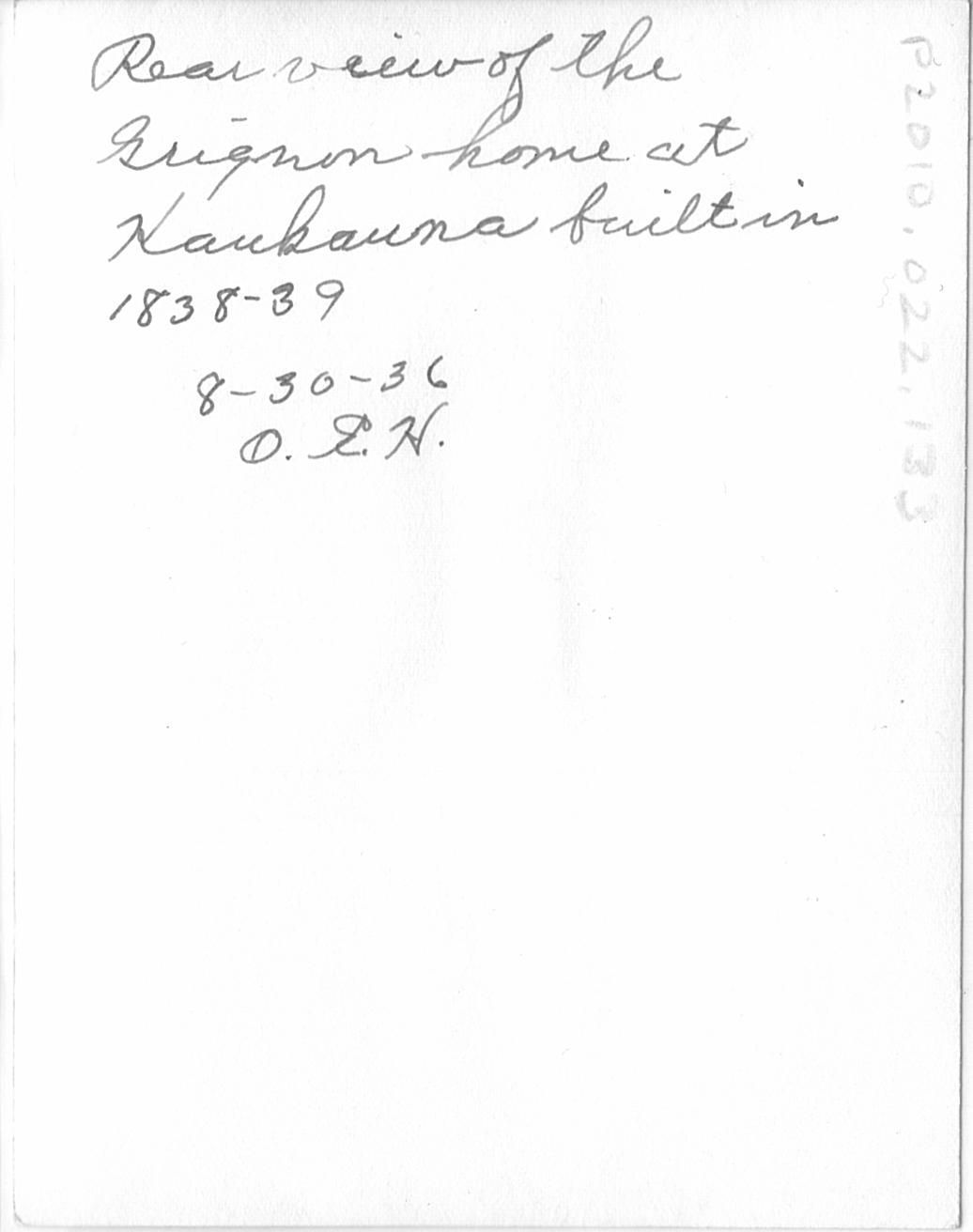 Back reads "Rear view of the Grignon home at Kaukauna built in 1838-39. 8-30-36. O.E.H."Collection