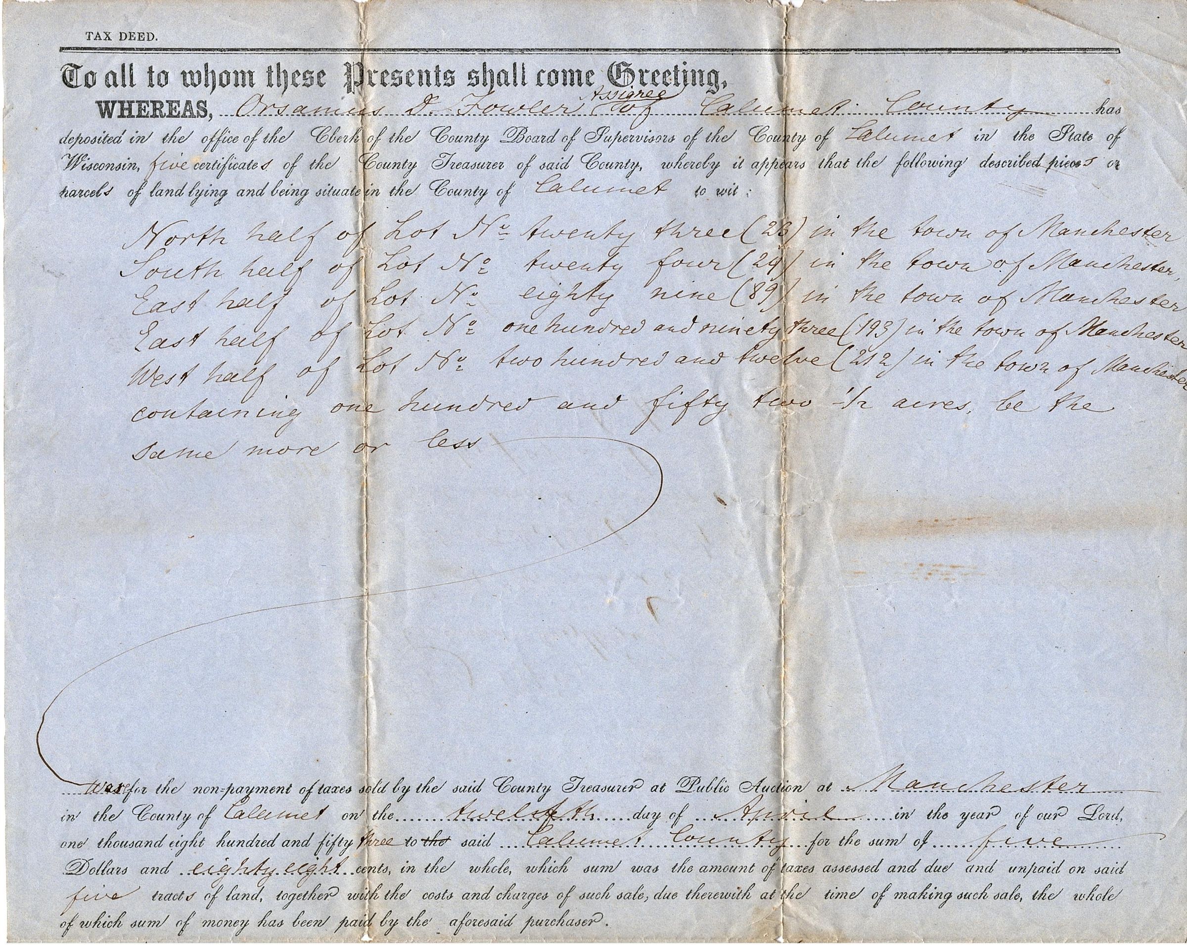 Oversized official document-tax deed (failure to pay taxes). Calumet County to O.D. Fowler. Register's office, Calumet County, Wis. Received for record March 13th A.D. 1857. The form is blue paper and is filled in with black ink. The top reads "To all to whom these presents shall come Greeting". There is a large squiggle connecting the last word of the written paragraph at the top and the first word of the printed paragraph in the middle. There is a Notary Public stamp in the bottom right corner of the form.Collection