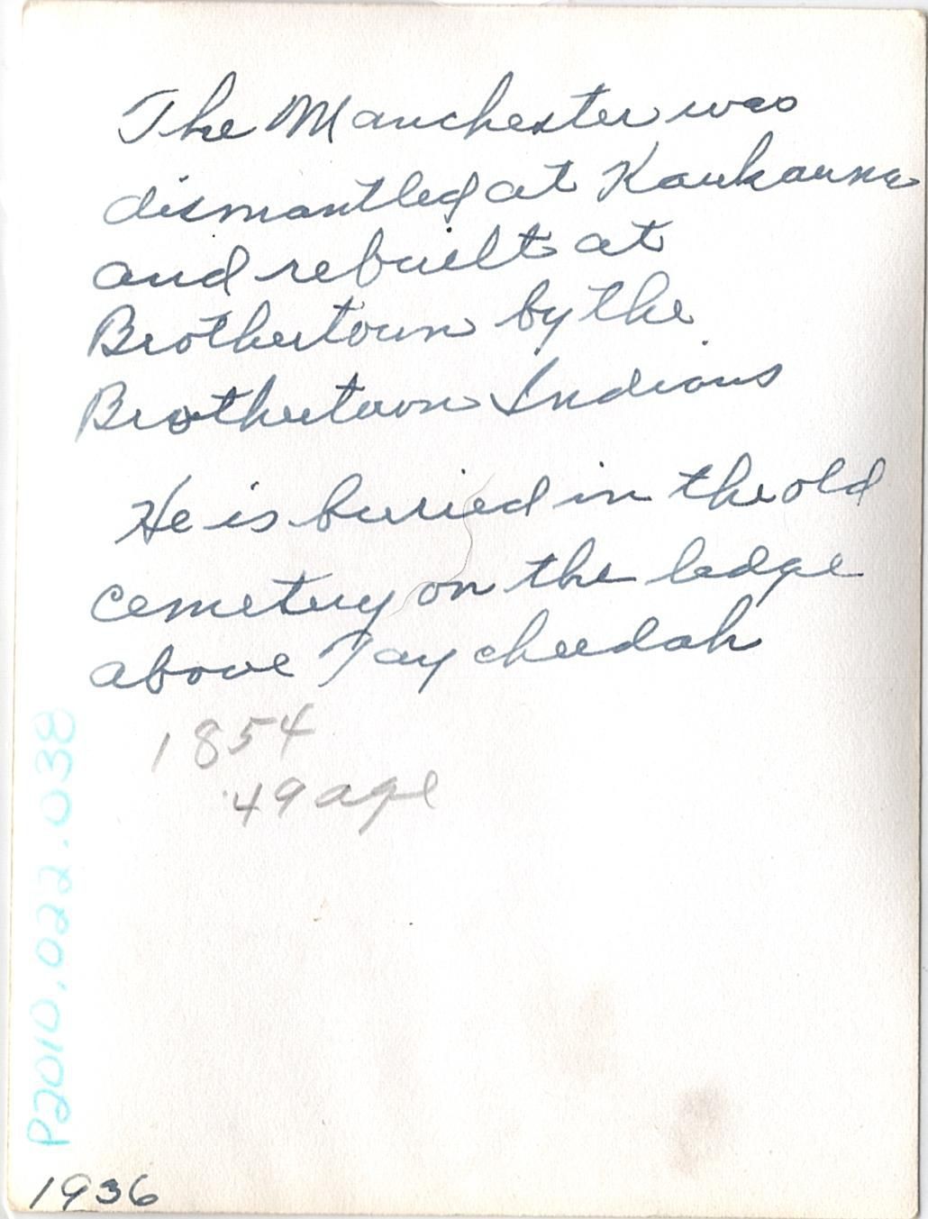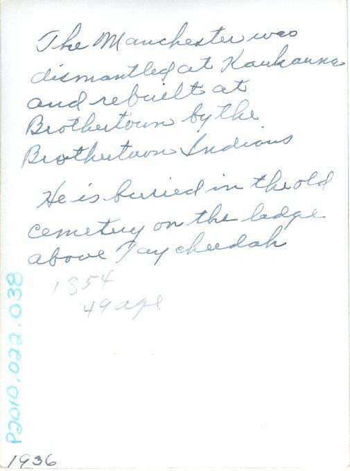 "The Manchester was dismantled at Kaukauna and rebuilt at Brothertown by the Brothertown Indians. He is buried in the old cemetery on the ledge above Taycheedah" and written underneath this in pencil is "1854 49 age" and "1936" in the bottom left cornerLocation