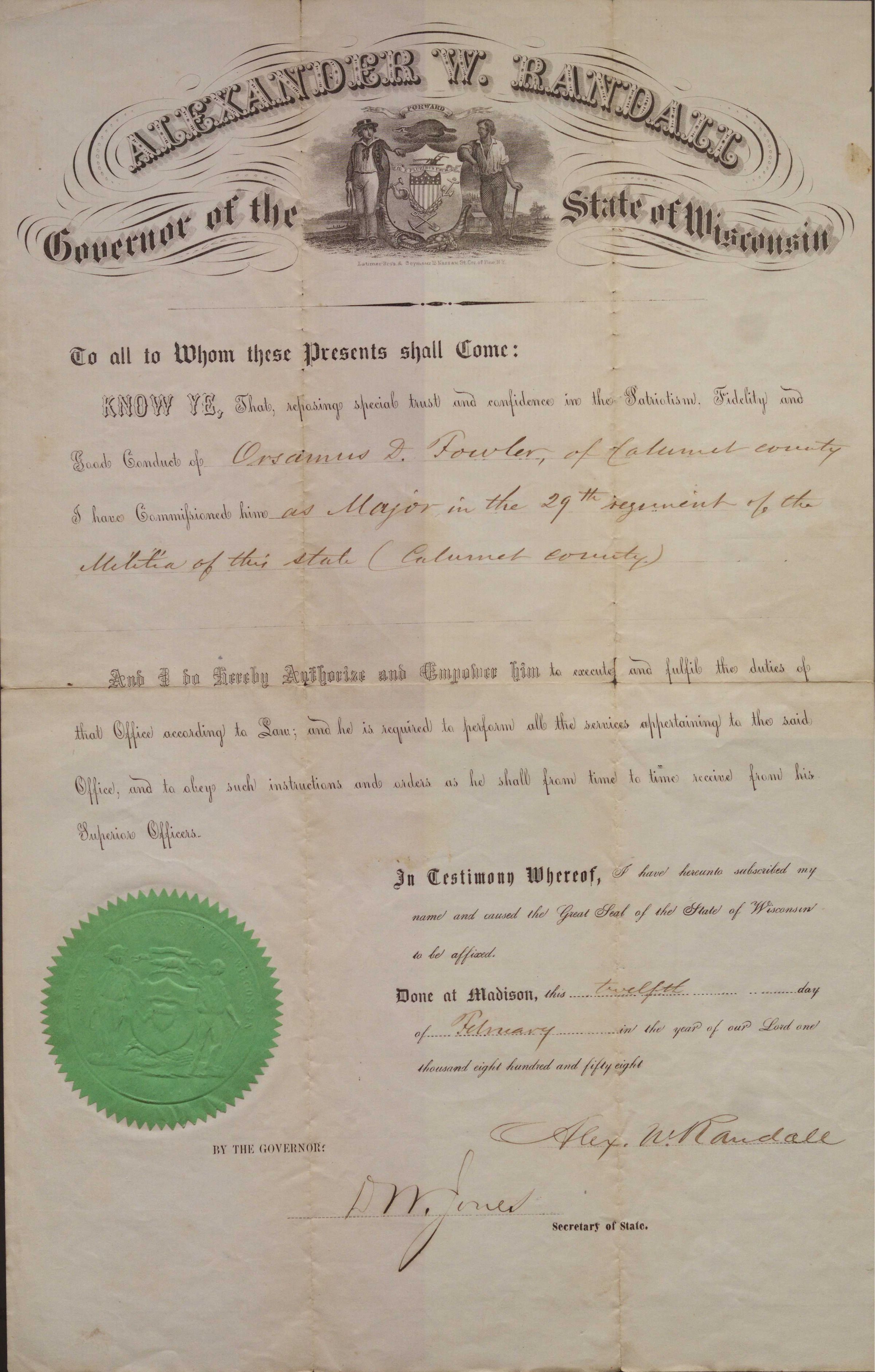 Oversized official document-promotion to Major in the 29th regiment of the militia of the state of Wisconsin (Calumet County). There is a large picture for the letterhead that has two men standing on either side of the seal Wisconsin (as seen on the state flag) with "Forward" at the top. In large letters around this seal is "Alexander W. Randall, Governor of the State of Wisconsin". The letter is signed by him and the secretary of the state on the 12th of February 1858. There is a large green sticker on the left side near the bottom that also has the state seal as a raised stamp.Collection