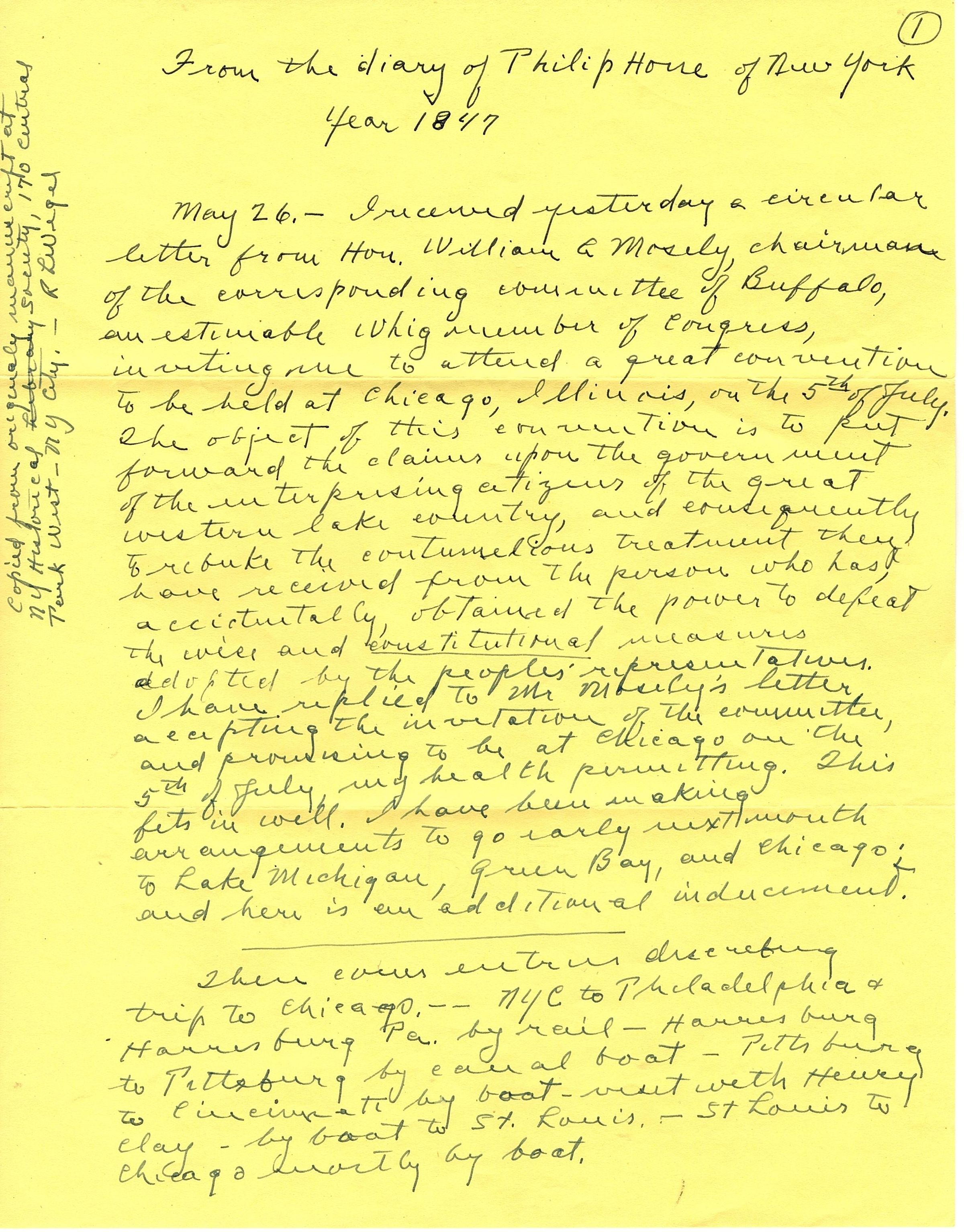 Five sheets of yellow paper with hand written notes in black ink on only one side of each sheet of paper. On the first page along the left edge it reads "copied from ---- ---- at NY Historical Society, 170 ---" (writing is hard to read). The top reads "From the diary of Philip Houe of New York, year 1847" it talks about a letter he received from William Mosely. The envelope is with the notes addressed from Chilton Times-Journal, Chilton Wisconsin to O.E. Heller of Chilton Wisconsin.Collection