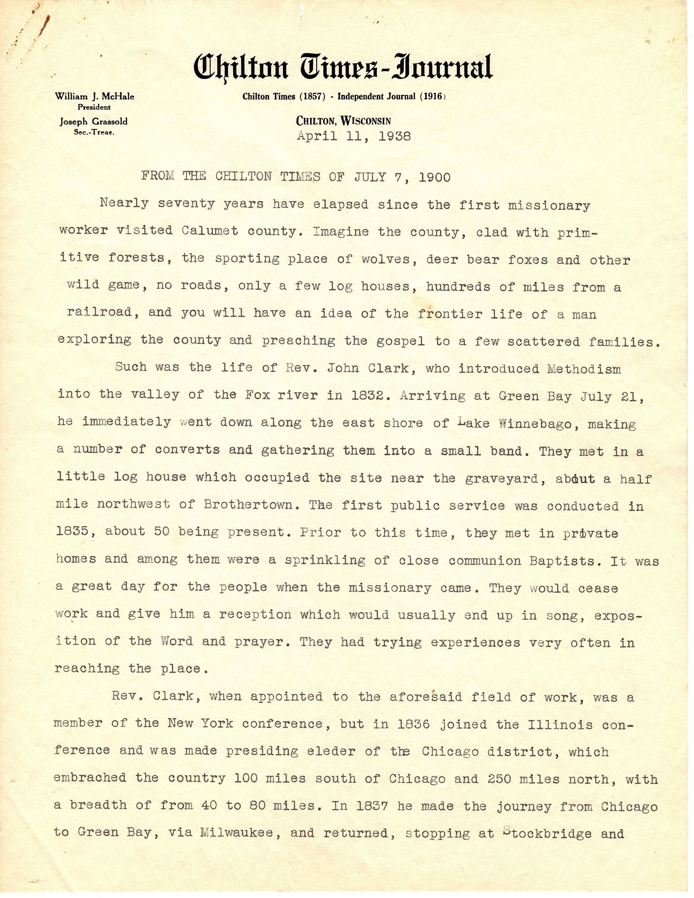 Two typed copies (one original, one carbon copy in blue ink) of an article published in the Chilton Times on July 7, 1900. It appears to have been typed up on April 11, 1938. It is seven pages long, single sided on Chilton Times-Journal letterhead paper. The last page has a time line of a series of events and services.Collection