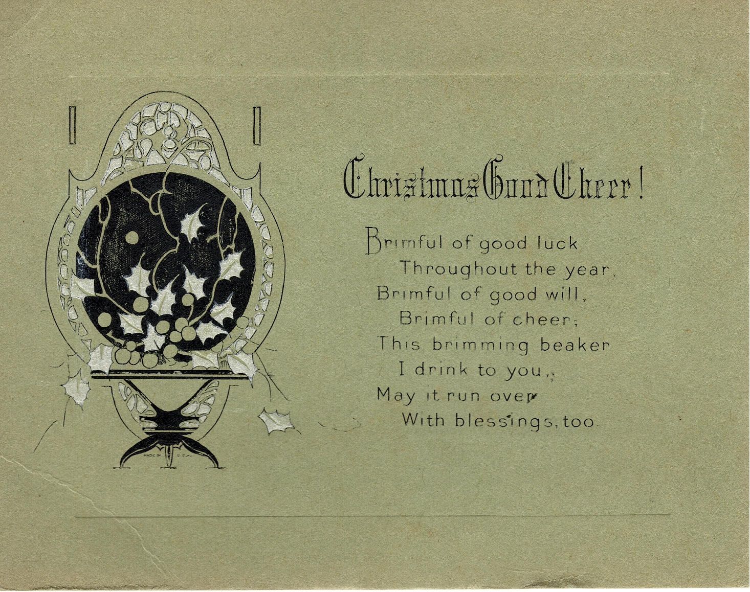 Small green card with a picture of holly and holly berries with a dark window/mirror behind it. Next to the image is a short poem "Christmas Good Cheer! Brimful of good luck, throughout the year, Brimful of good will, Brimful of cheer, This brimming beaker, I drink to you, May it run over, With blessings too". Written in pencil on the back is "From J. P. Johnson".Collection