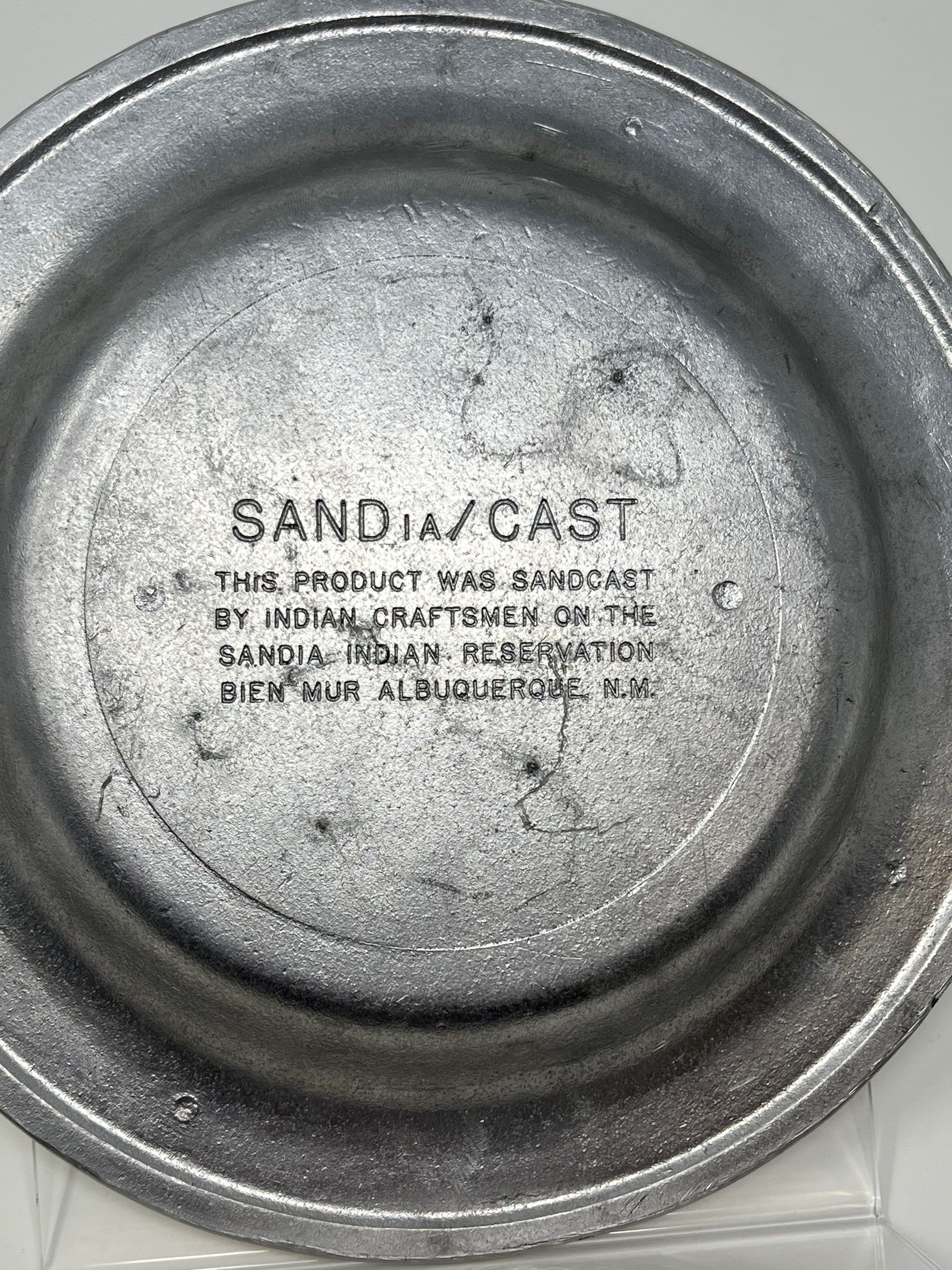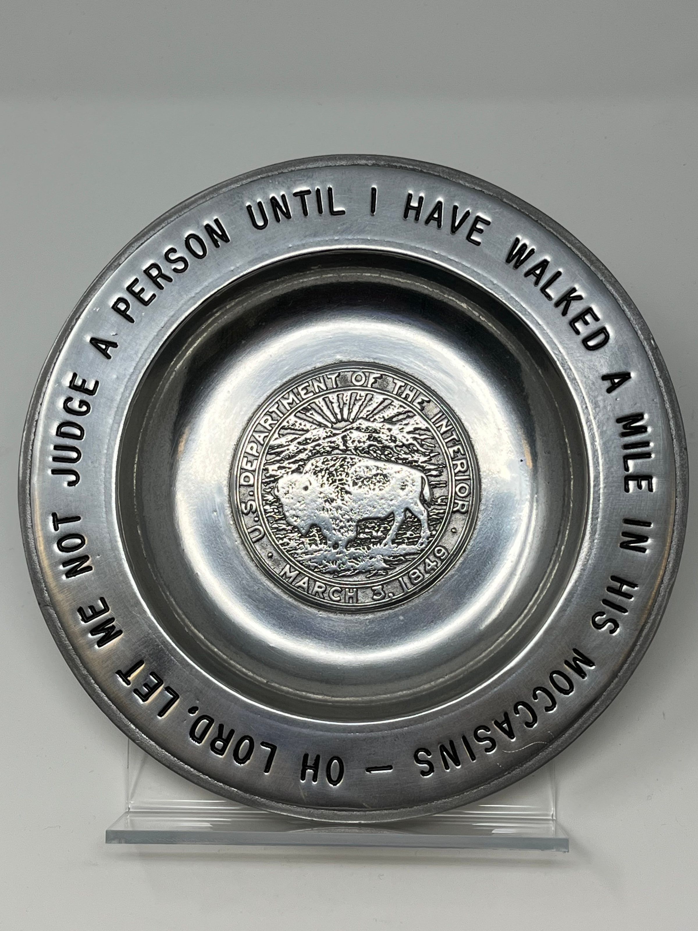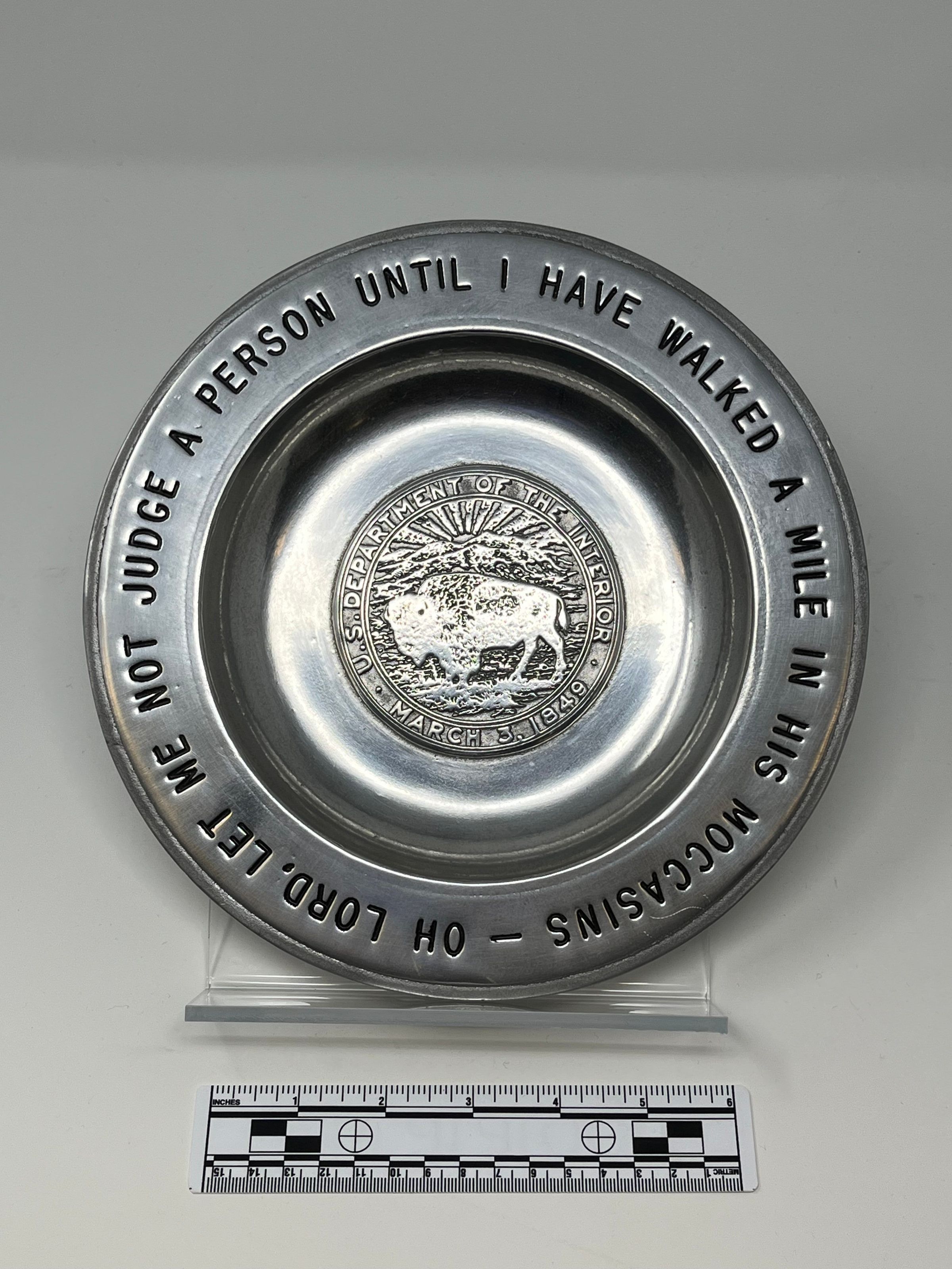 Sand/Cast plate that reads "Oh Lord, Let Me Not Judge a Person Until I have Walked a Mile in His Moccasins" with a buffalo in the middle in front of a rising/setting sun behind mountains and "U.S. Department of the Interior, March 3, 1949" around the buffalo. The back reads "Sandia/Cast, this product was sandcast by Indian craftsmen on the Sandia Indian Reservation Bien Mur Albuquerque, N.M."Collection