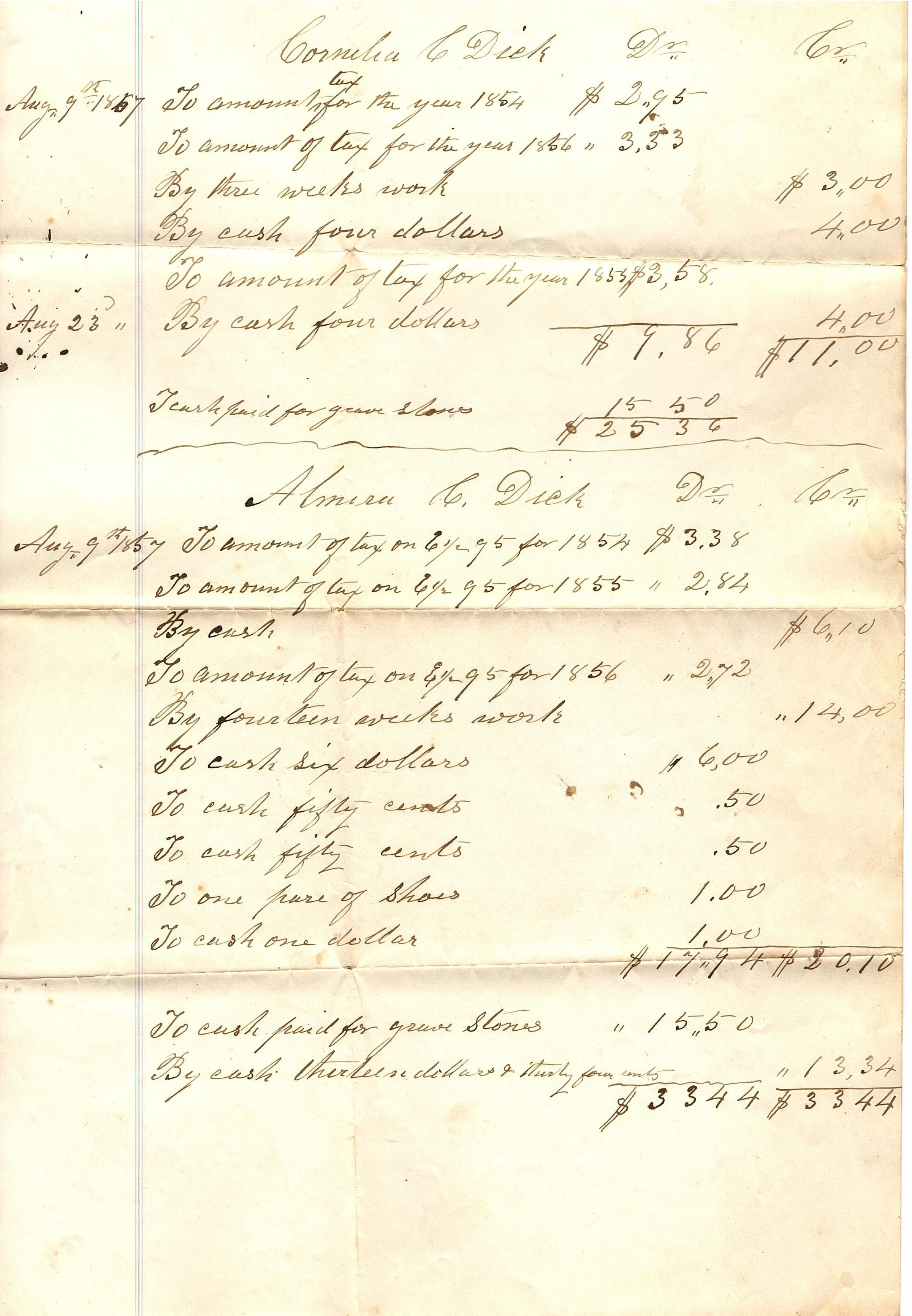 Single sheet of legal sized paper with a red-blue-red lined border down the left side. There are two portions for this receipt: the first is for Cornelia Dick and the second is for Almira Dick. They both appear to be receipts for payment on taxes for the year either by work or paid in cash and each has a grave stone payment at the bottom of the receipts. Three dates are in the left column: Aug 9th 1857, Aug 23, Aug 9th 1857. The entire list is written in a black ink.Collection