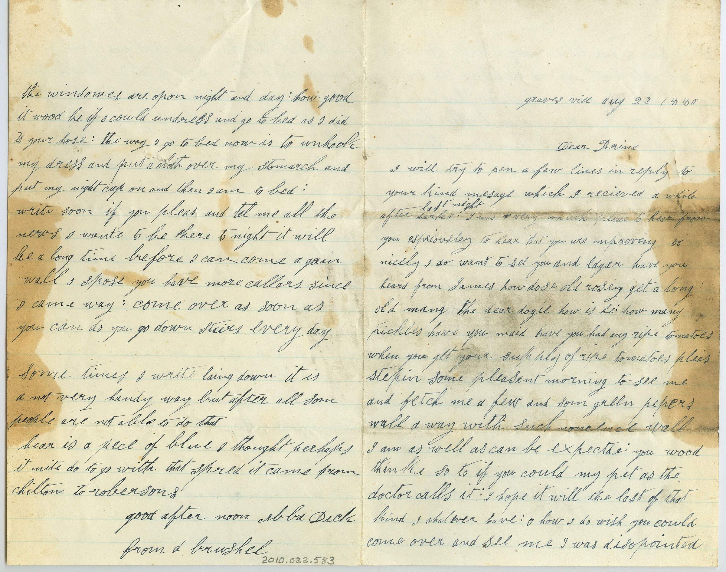 Four page correspondence written on a single sheet of folded, lined paper. The letter is addressed "gravesvill Aug 22 1880, Dear Friend" and is signed on the fourth page (opposite first page) "Good after noon Abba Dick, from a brushel". It is difficult to read the handwriting for content.Collection