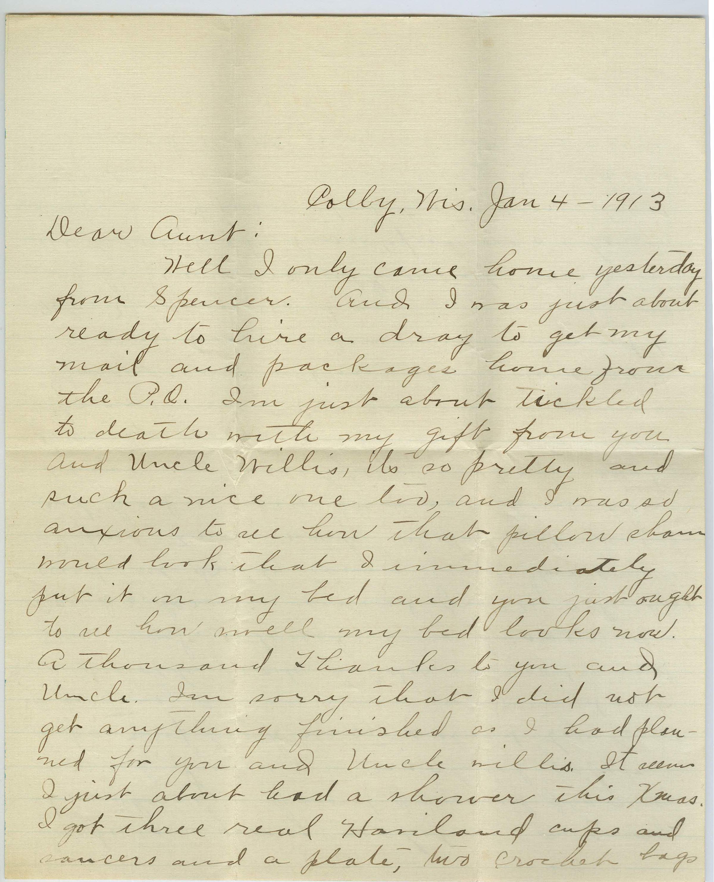 Three pages of correspondence on two separate pieces of paper. Writing is on the first page (BC2010.022.627A) both front and back and on page two (BC2010.022.627B) just the one side. Page one is addressed "Colby, Wis. Jan 4-1913, Dear Aunt:" and talks about how she just got home to find a gift from the receiver (a pillow) and apologizes she didn't get what she wanted done for them. The back of this sheet is written upside down and continues to list all the gifts she received. The second piece of paper starts by talking about Marcia and their feast of pork and head cheese. It is signed at the bottom of this page "love to all, Hattie".