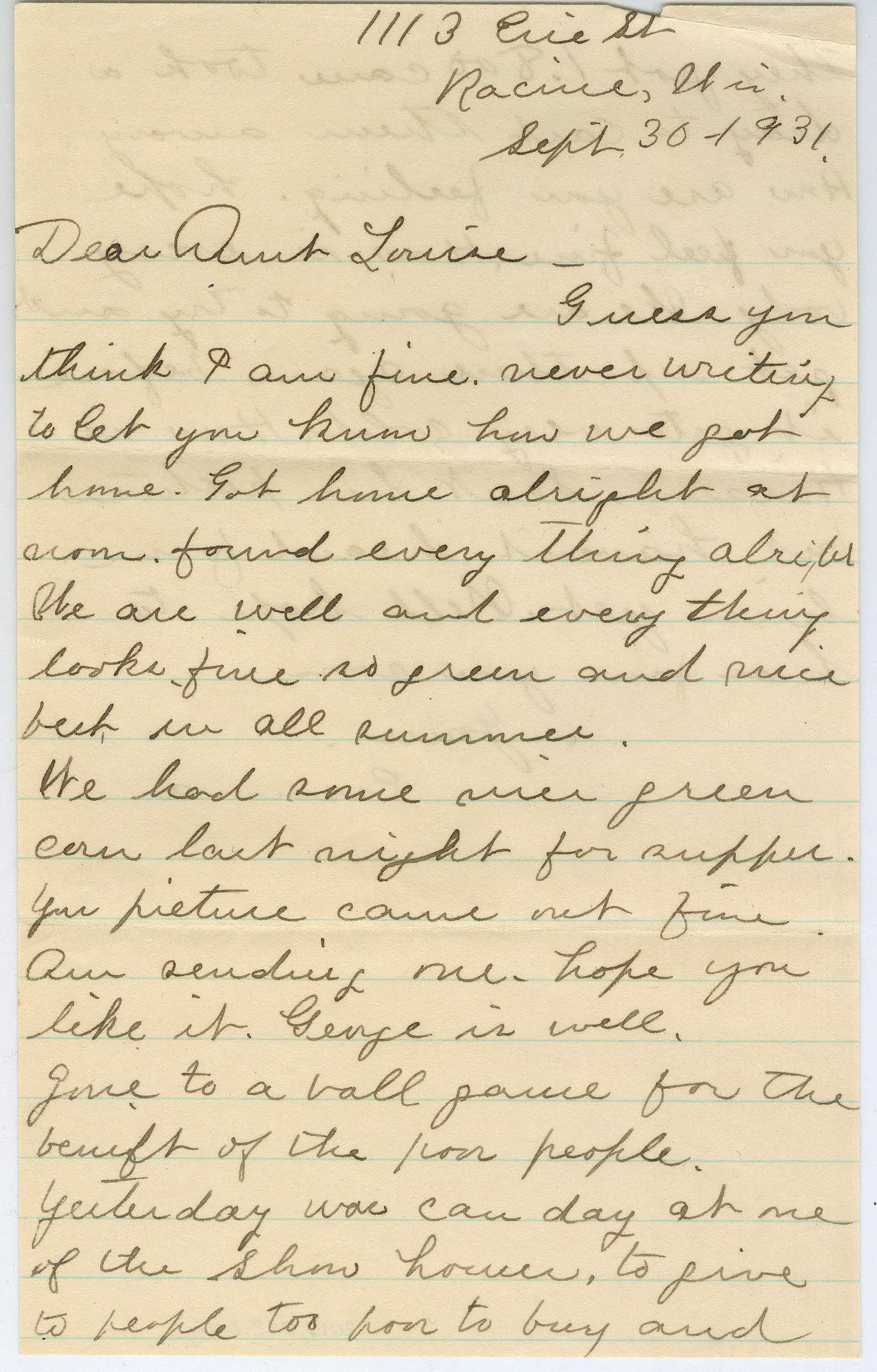 Two page correspondence on a single sheet of lined paper. The letter is addressed "1113 Erie St., Racine, Wis. Sept 30-1931, Dear Aunt Louise". It talks about making it home fine, eating corn for supper, and picture she is sending her. It is signed on the back "Yours Erica" (not sure of the name).