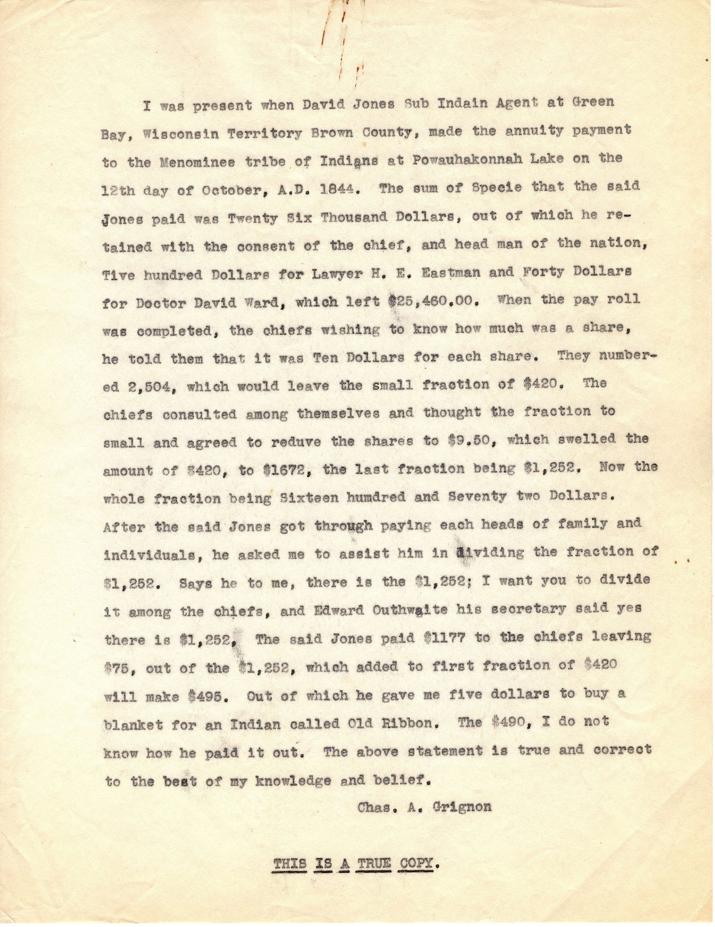 Single sheet of typed correspondence with no address. It reads "I was present when David Jones Sub Indain [sic] Agent at Green Bay, Wisconsin Territory Brown County, made the annuity payment to the Menominee Tribe of Indians at Powauhakonnah Lake on the 12th day of October, A.D. 1844. The sum of Specie that the said Jones paid was Twenty Six Thousand Dollars, out of which re retained with the consent of the chief, and head man of the nation, Tive [sic] hundred Dollars for Lawyer H.E. Eastman and Forty Dollars for Doctor David Ward, which left $25,460.00. When the pay roll was completed, the chiefs wishing to know how much was a share, he told them that it was Ten Dollars for each share. They numbered 2,504, which would leave the small fraction of $420. The chiefs consulted among themselves and thought the fraction to small and agreed to reduve [sic] the shares to $9.50, which swelled the amount of $420, to $1672, the last fraction being $1,252. Now the whole fraction being Sixteen hundred and Seventy two Dollars. After the said Jones got through paying each heads of family and individuals, he asked me to assist him in dividing the fraction of $1,252. Says he to me, there is the $1,252; I want you to divide it among the chiefs, and Edward Outhwaite his secretary said yes there is $1,252. The said Jones paid $1177 to the chiefs leaving $75, out of the $1,252, which added to first fraction of $420 will make $495. Out of which he gave me five dollars to buy a blanket for an Indian called Old Ribbon. The $490, I do not know how he paid it out. The above statement is true and correct to the best of my knowledge and belief. Chas. A. Grignon".Collection