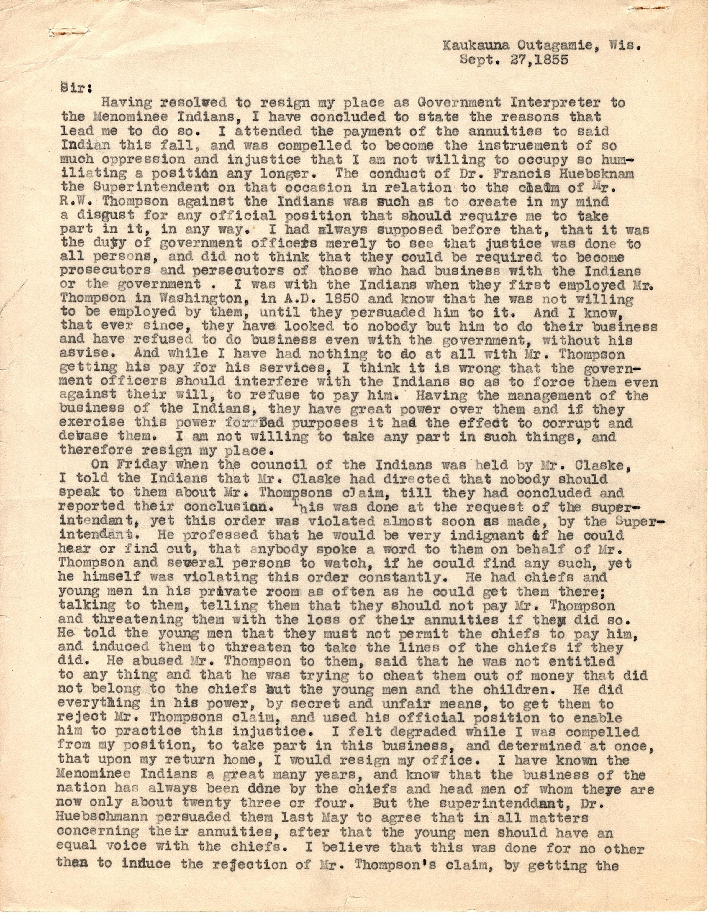 Two typed pages of correspondence signed Chas. A. Grignon, U.S. Interpreter on behalf of Hon. Geo. W. Manyanny Commissioner of Indian affairs, Washington City. D. Columbia. It is just addressed to 'sir' from Kaukauna Outagamie, Wis. Sept. 27, 1855. It is the resignation letter of Chas. A. Grignon because he was "compelled to become the instruement [sic] of so much oppression and injustice that I am not willing to occupy so humiliating a position any longer". It outlines a series of events by R.W. Thompson, the Menominee Indians, Mr. Claske or Clarke (spelled both ways in the letter).Collection
