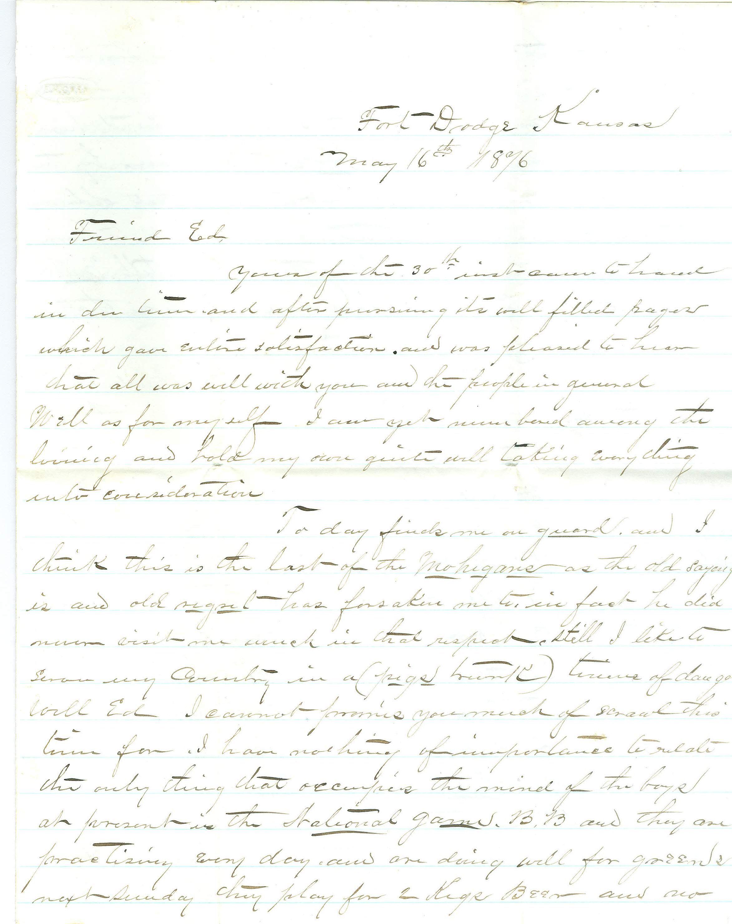 Three page correspondence written on two pages of attached paper (the last page is blank). The letter is addressed "Fort Dodge Kansas, May 16th 1876, Friend Ed". The signature is on the bottom of the third page and reads "yours as ever, L.C. Dick" and in the bottom left corner "E.M. Dick, Brothertown Wis". The letter is difficult to read for content. There is a stamp in the top left corner of the first page and it looks like it reads "E.H. OWEN" in an oval.Collection