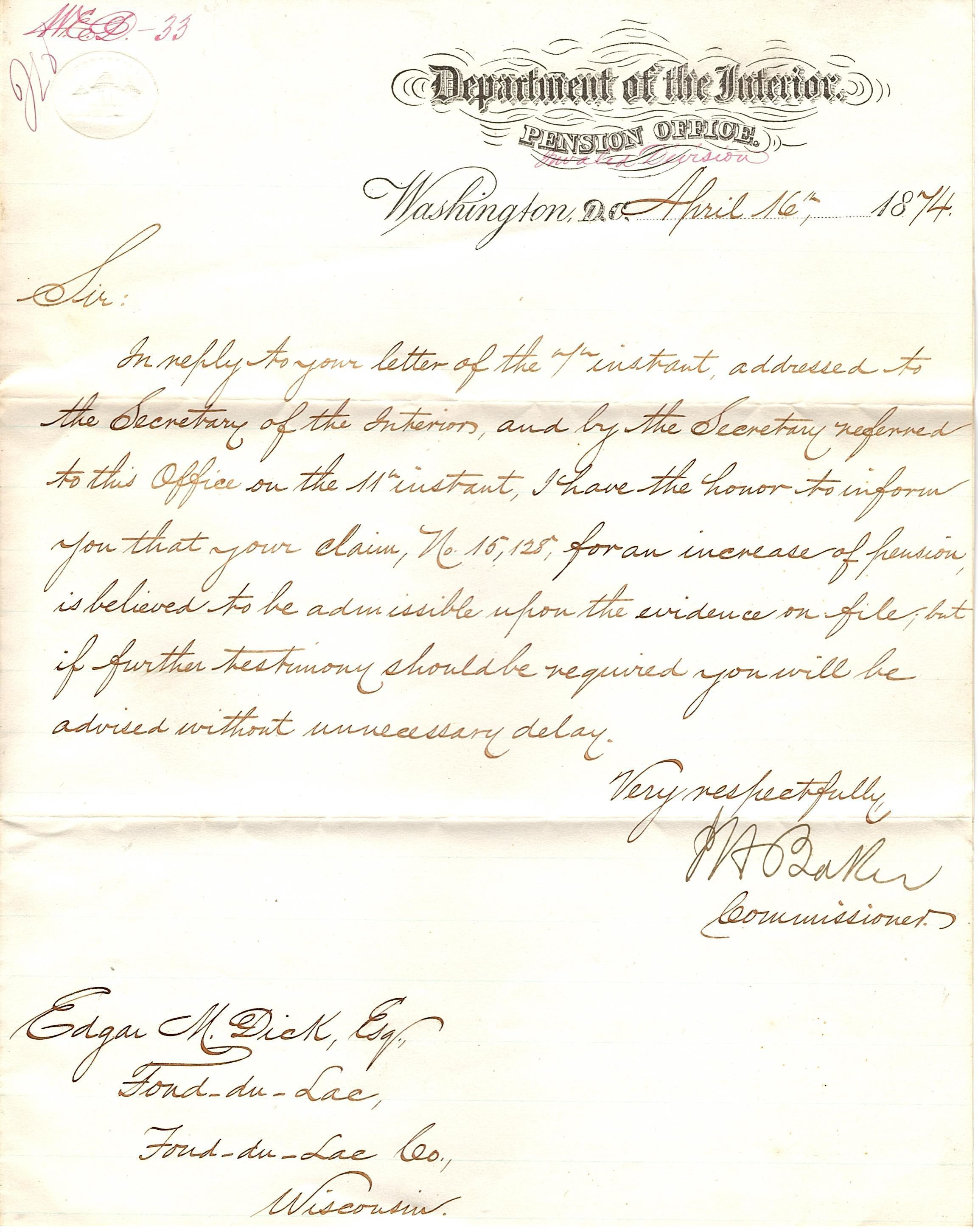 Long sheet of paper folded in half with writing only on the front page of the folded paper. The letterhead is from the Department of the Interior, Pension Office. It is addressed to Edgar M. Dick of Fond du Lac on April 16th, 1874. It is in response to a request for an increase in pension which is "believed to be admissible upon the evidence on file, but if further testimony should be required you will be advised without unnecessary delay." It is signed "Very respectfully, JA Baker, Commissioner.Collection