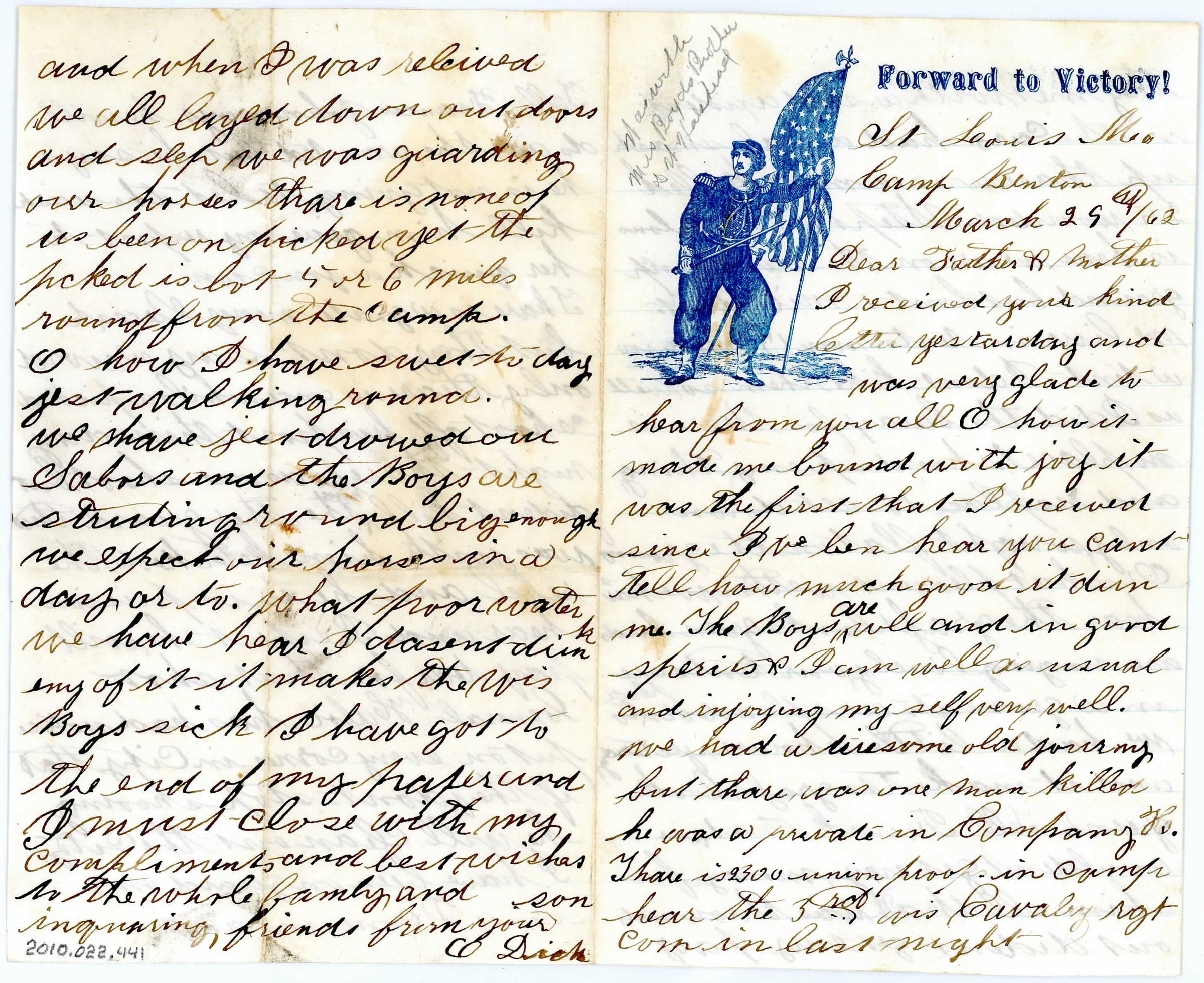 Single sheet of paper, folded in half to create four pages of correspondence. On the top of the first page is a stamp of a soldier holding an American flag and "Forward to Victory!" all in blue ink. The letter is addressed "St. Louis Mo camp Benton, March 19th /62. Dear Father and Mother". It talks about missing home, how there was a bad crash of cars with 10 men killed and 25 wounded. It talks about life in the camp with 17 men to a tent. There was a shoot off between guards and one is now in prison. It ends "I must close with my compliments and best wishes to the whole family and inquiring friends from your son E. Dick". Written in the corner above the blue stamp in pencil is "Was with Mrs. Boyd's Brother DN Halshead". There is also a pressed stamp in the top left corner of the first page that goes through to the last page (two stamps in the middle of the unfolded paper). Can't make it out other than it's a circle with flourishes around it.Collection