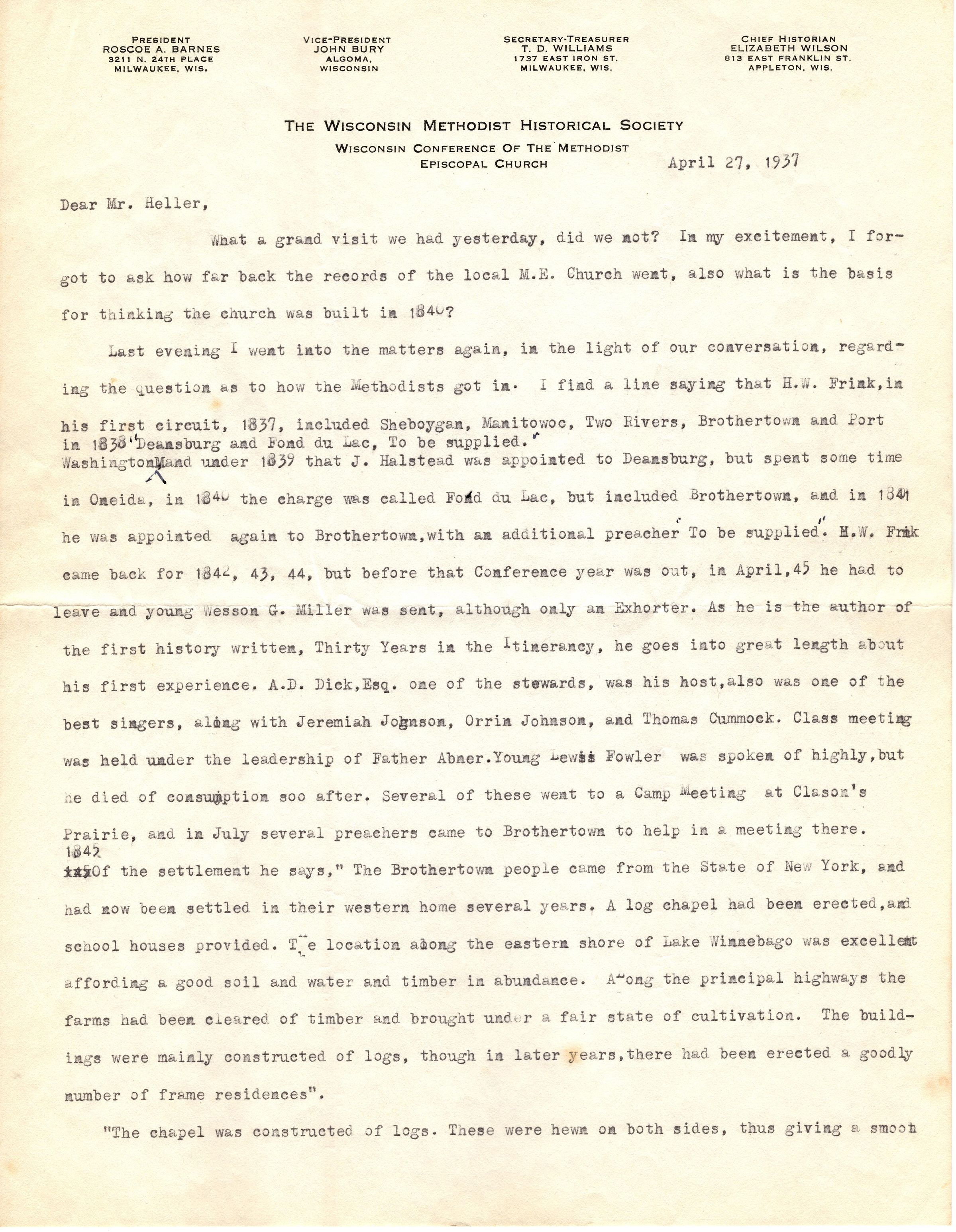 Two page, typed correspondence on The Wisconsin Methodist Historical Society letterhead. It is addressed "April 27, 1937 Dear Mr. Heller". It talks about the meeting the previous night and how it inspired her to look into more information and she is sharing that information about Brothertown, the Methodist church, and the erection of a log church. She is sharing this information and requests that if O.E. Heller finds anything he will share with her. It is signed "Most gratefully, Elizabeth Wilson".Collection