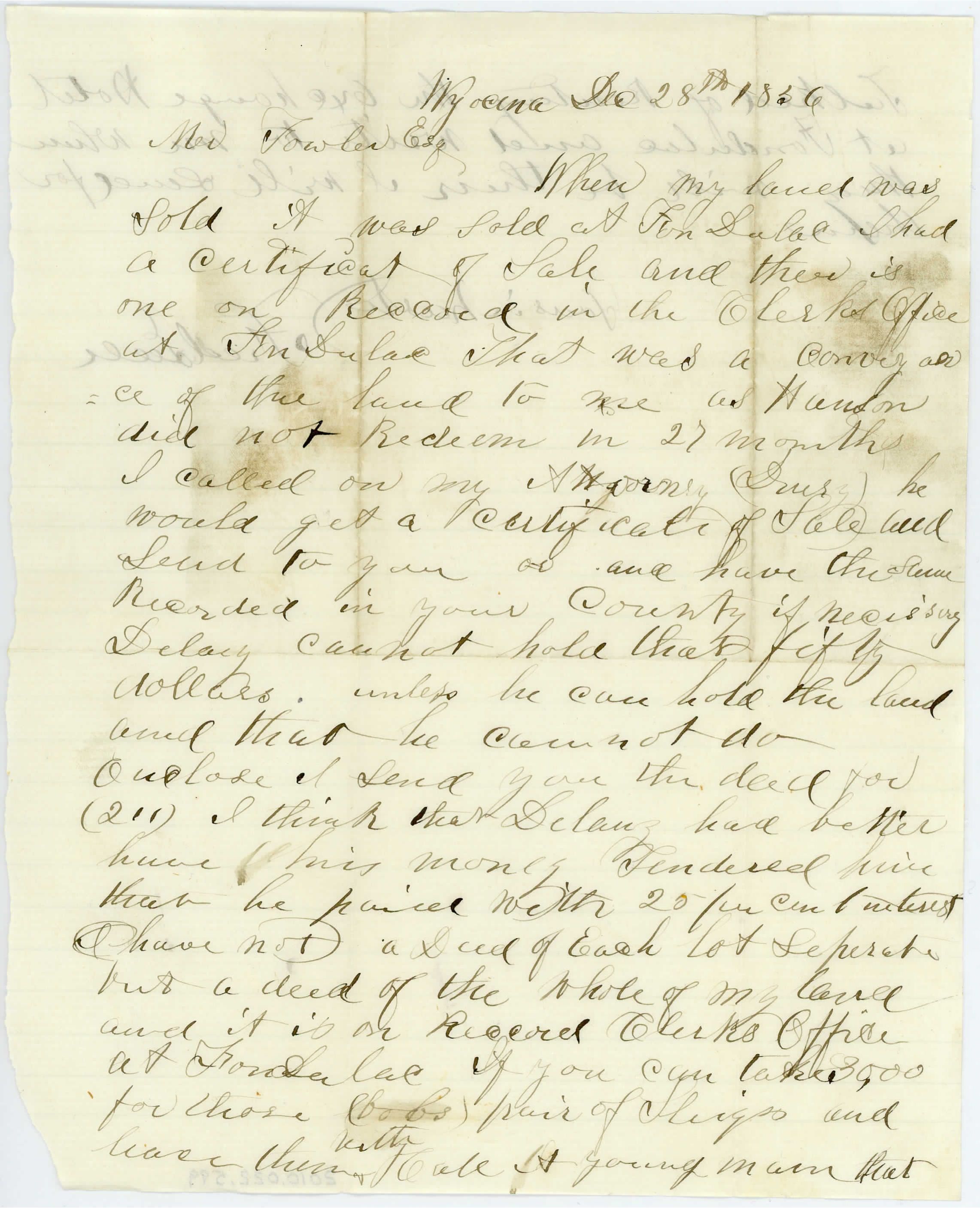 One page correspondence to Mr. Fowler Esq from Fred Leele dated Dec 28th, 1856. Talks about selling land and the money for lots.Collection