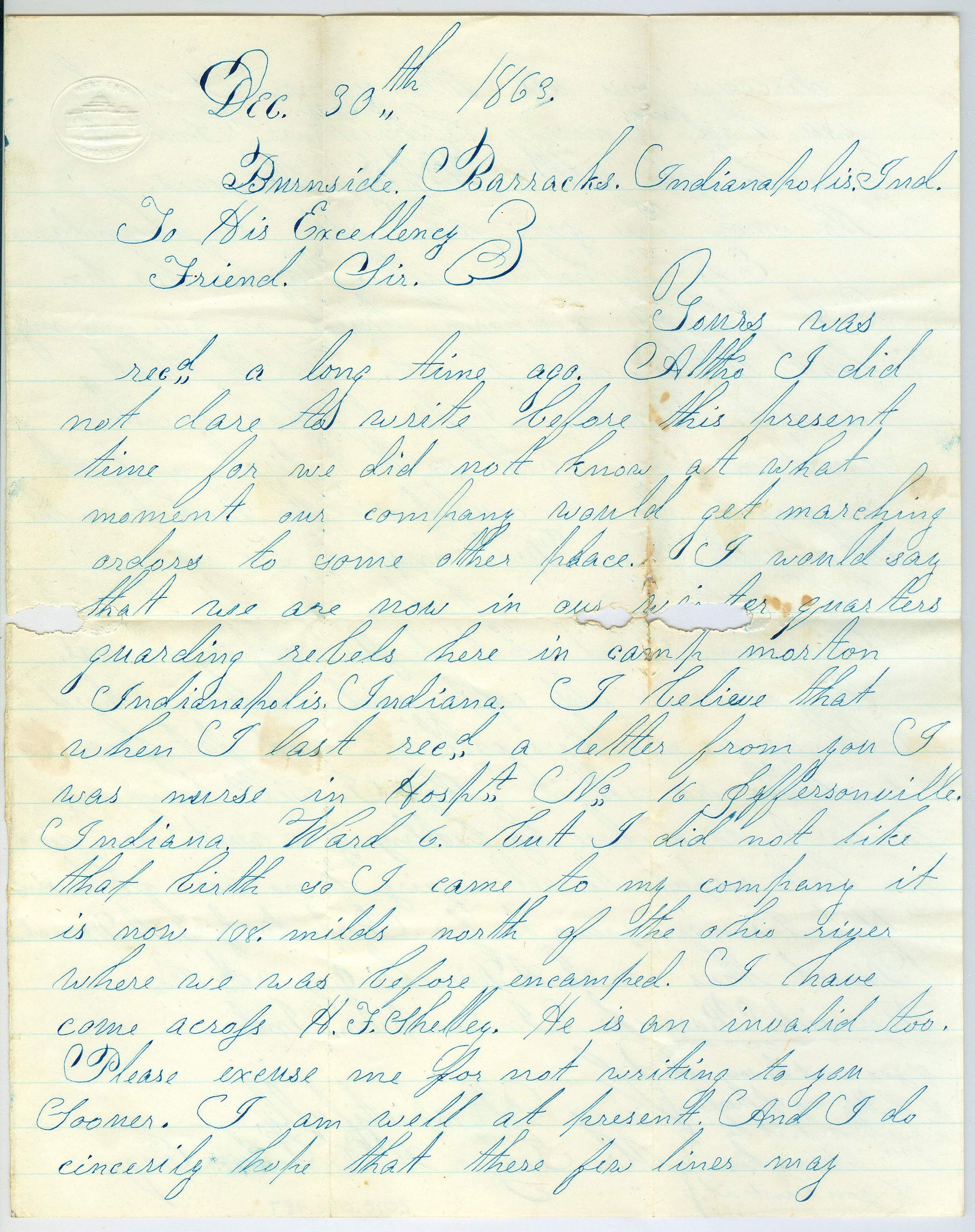 Single sheet of paper with writing on both sides in blue ink. The letter starts "Dec. 30th 1863, Burnside Barracks, Indianapolis, Ind. To His Excellency and Friend, Sir" and signed "Verry [sic] Respectifully [sic], Mr. George A. Durschie, Esq." It talks about how his company is guarding rebels in Indianapolis and he didn't write sooner because they were unsure when they would get marching orders. He offers to send a song called "the battle cry of freedom". There is a stamp in the top left corner of a large building in a circle and "West End Congress".Collection