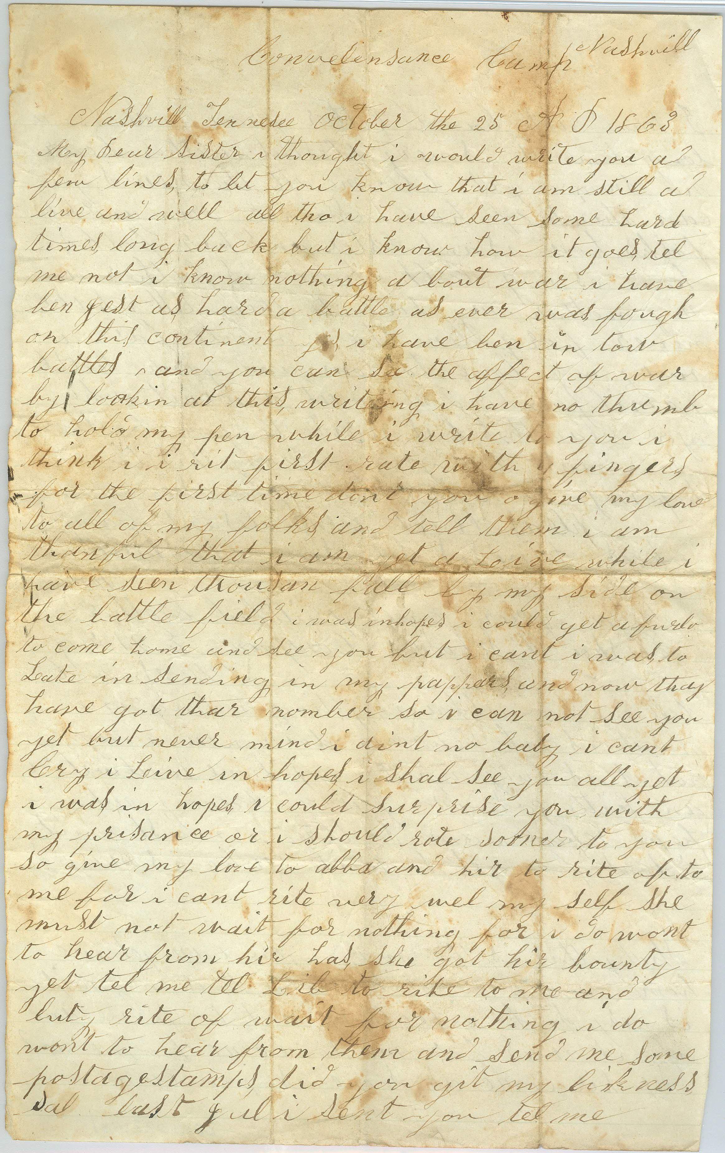 Single sheet of paper folded in half to create four pages of correspondence, last page is blank. The letter is addressed "Camp Dawson, Alabama, Sept 1st 1863. My Dear Cousin" and is signed "Please direct to Murfreesboro, Tennessee 21 regt. Wis vol, from George Samson". The company is in the mountains and wonders how long the Civil War will last.Collection