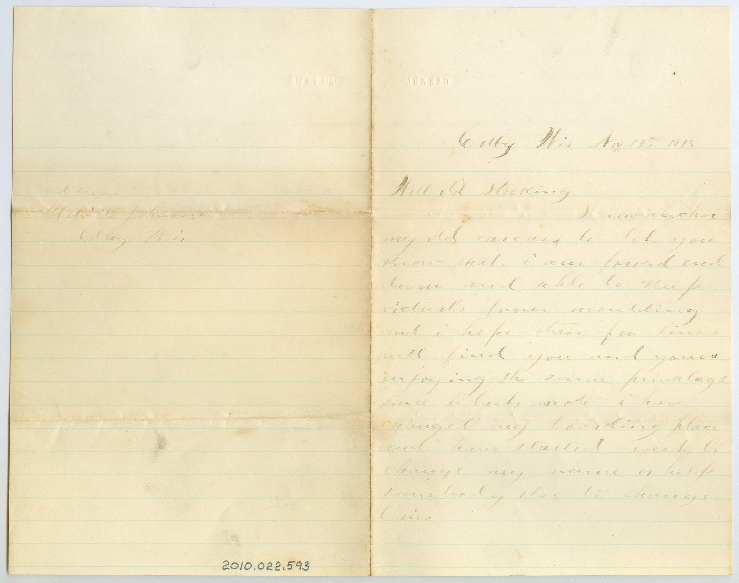 Three page correspondence on a single sheet of folded, lined paper. The last page is nearly blank except for "Address, Melville Johnson, Colby, Wis." The letter is addressed "Colby Wis, May 13th 1885, Well old Stocking". There is a stamp in the top left corner of the first page that says "JUNEAU". The ink is a faded black almost brown color and is faded badly in parts. The letter is signed on the third page "so good day, M. Johnson, to James".Collection