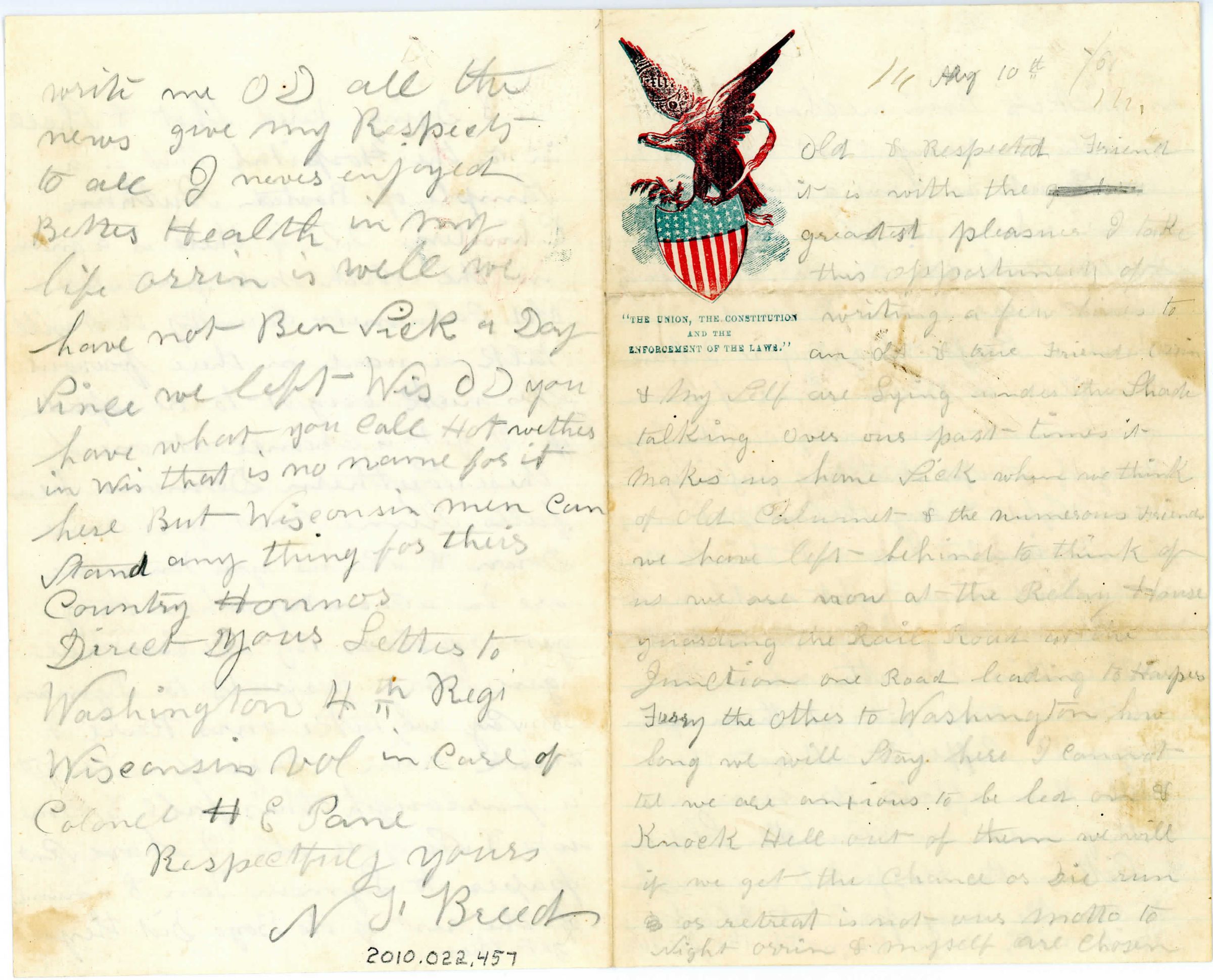 Single sheet of paper, folded in half, to create four pages of correspondence. The first page (just right of the unfolded center crease) has an eagle stamp in red, blue, and brown. The eagle has its wings spread, a branch in one talon and is standing on a shield with the American flag design on it. There is a red ribbon wrapped around the eagle. Under the shield it reads "The union, the constitution and the enforcement of laws". The letter is addressed "III Aug 10th /61 III Old and Respected Friend..." and is signed "Direct your letter to Washington 4th Regi Wisconsin vol in care of Colonel HE Pane. Respectfully yours NJ. Breed". Talks about the weather and the scenery, about atrocities of war including use of wounded soldiers, and inquiring about people at home.Collection