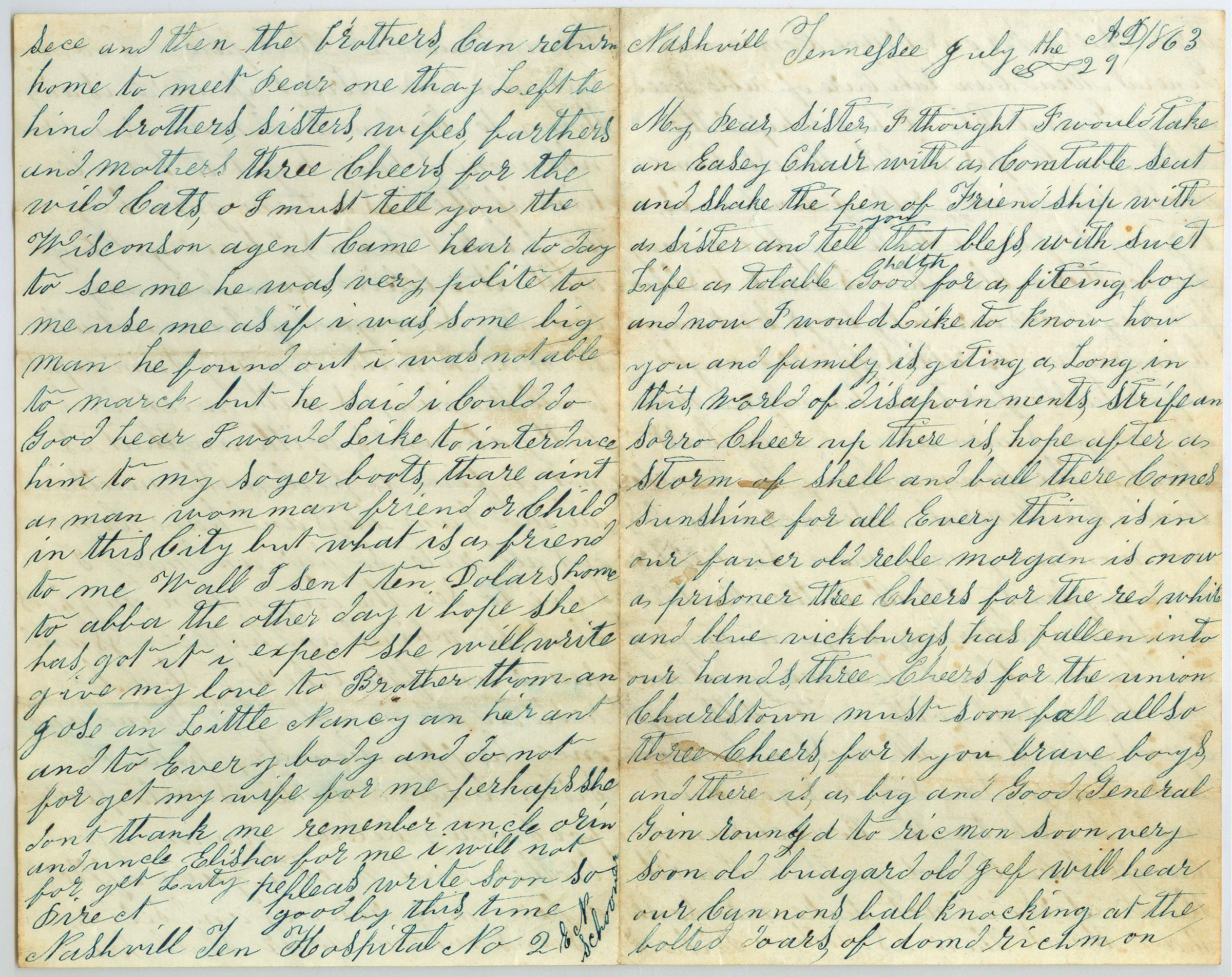 Single sheet of paper folded in half to create four pages of correspondence. The writing goes to each corner of all four pages and is in a dark blue ink. The first page is addressed "Nashvill [sic] Tennessee July the 29 AD 1863. My dear sister" and is signed Good by this time, Direct Nashvill Ten Hospital No 2, N. Schooner". It talks about a victory at Vicksburg and how Charlstown [sic] must fall soon as well.Collection
