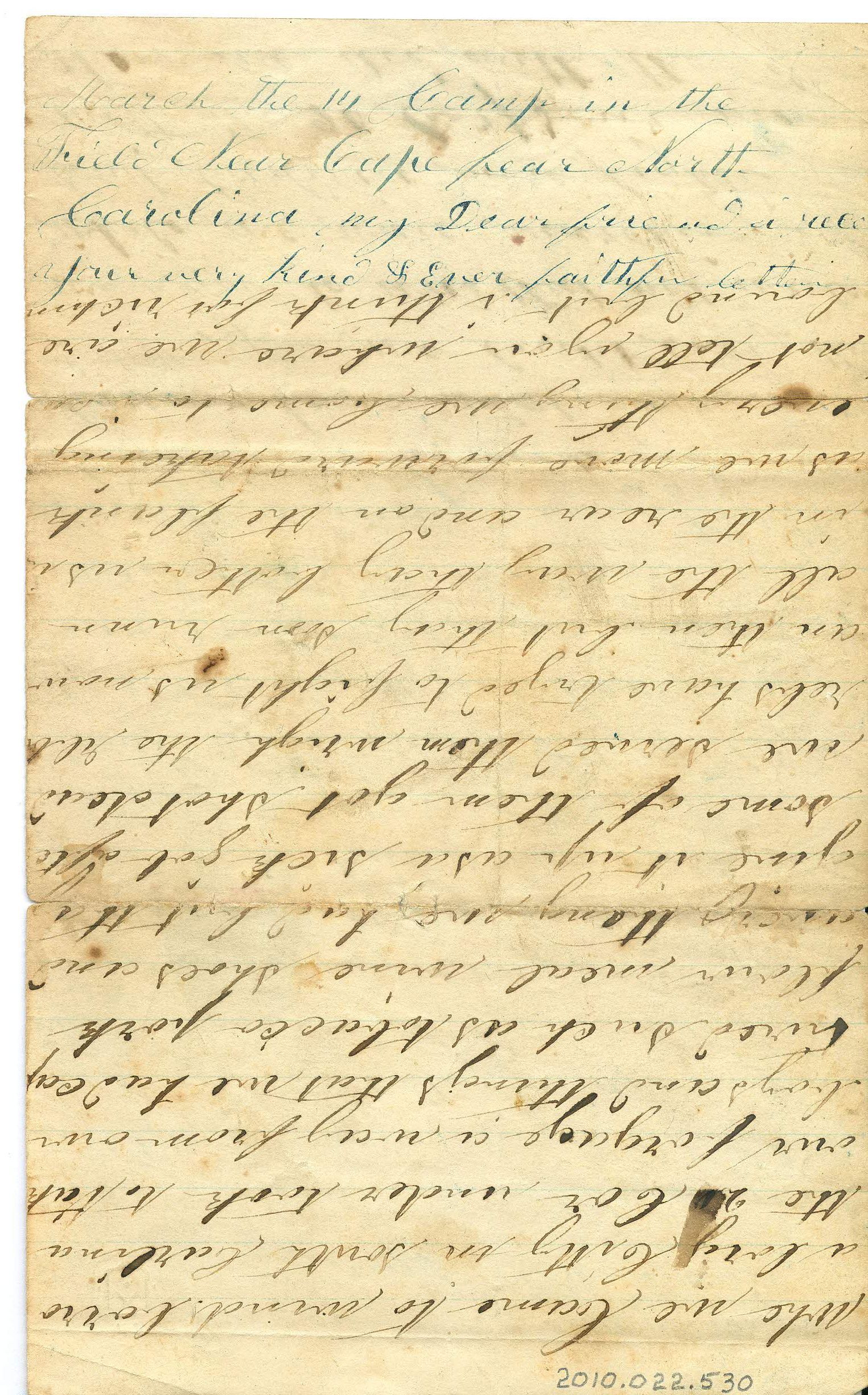 BC2010.022.530B is an envelope, most likely from O.E. Heller rather than the writer of the letter. On one side of the envelope it reads "No. 74, Place: Camp in the field near Cape Fear, North Carolina, Date: March 14, 1865, From: No Name, on the march with Sherman".Collection