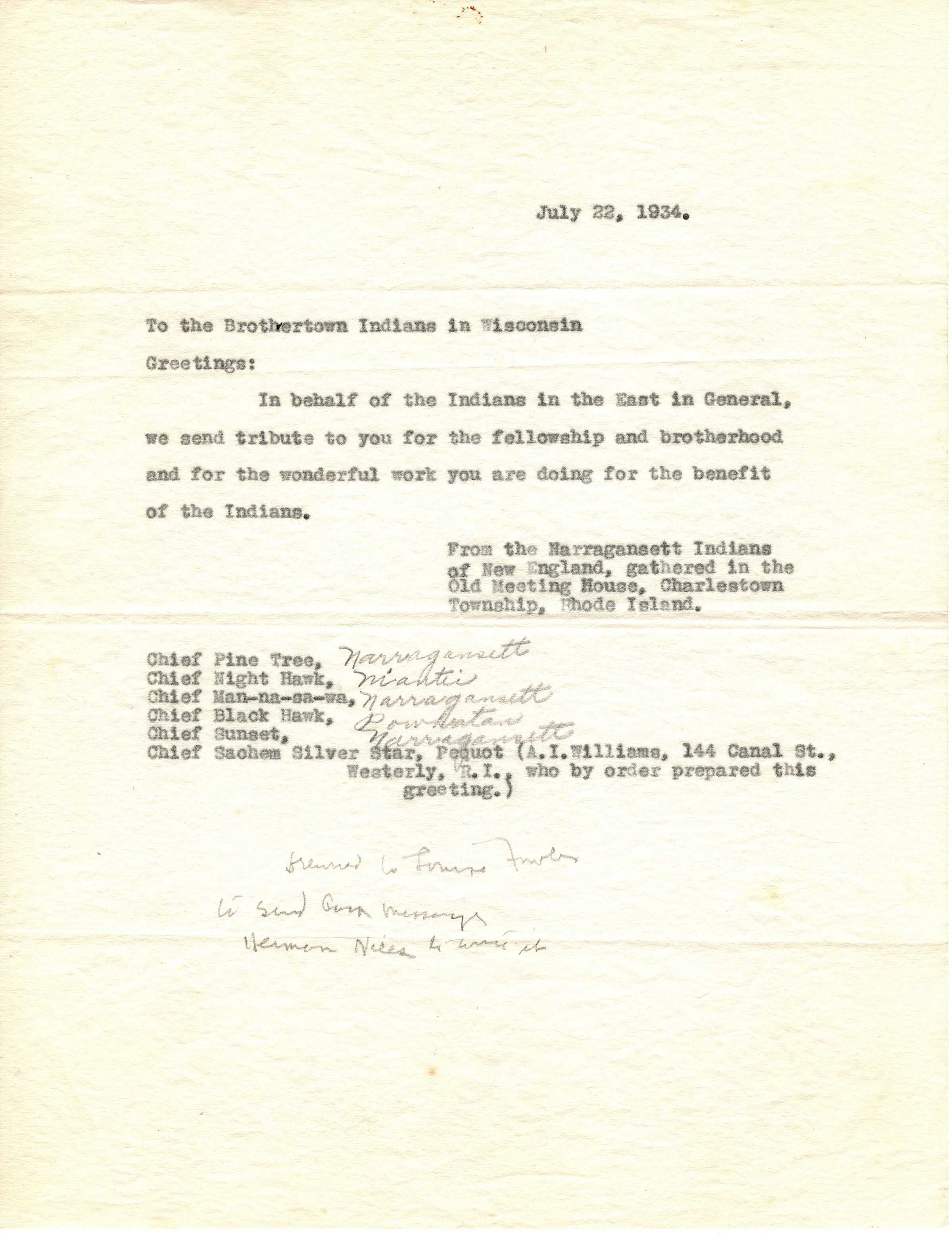 Single page typed correspondence addressed "July 22, 1934, To the Brothertown Indians in Wisconsin, Greetings: In [sic] behalf of the Indians in the East in General, we send tribute to you for the fellowship and brotherhood and for the wonderful work you are doing for the benefit of the Indians. From the Narragansett Indians of New England, gathered in the Old Meeting House, Charlestown, Rhode Island. Chief Pine Tree, Chief Night Hawk, Chief Man-na-sa-wa, Chief Black Hawk, Chief Sunset, Chief Sachem Silver Star, Pequot (A.I. Williams, 144 Canal St., Westerly, R.I. who by order prepared this greeting". Written in pencil next to each name is the tribe they are from either Narragansett, Niantic, or Powhatan. There is also a message at the bottom written in pencil that is illegible.Collection