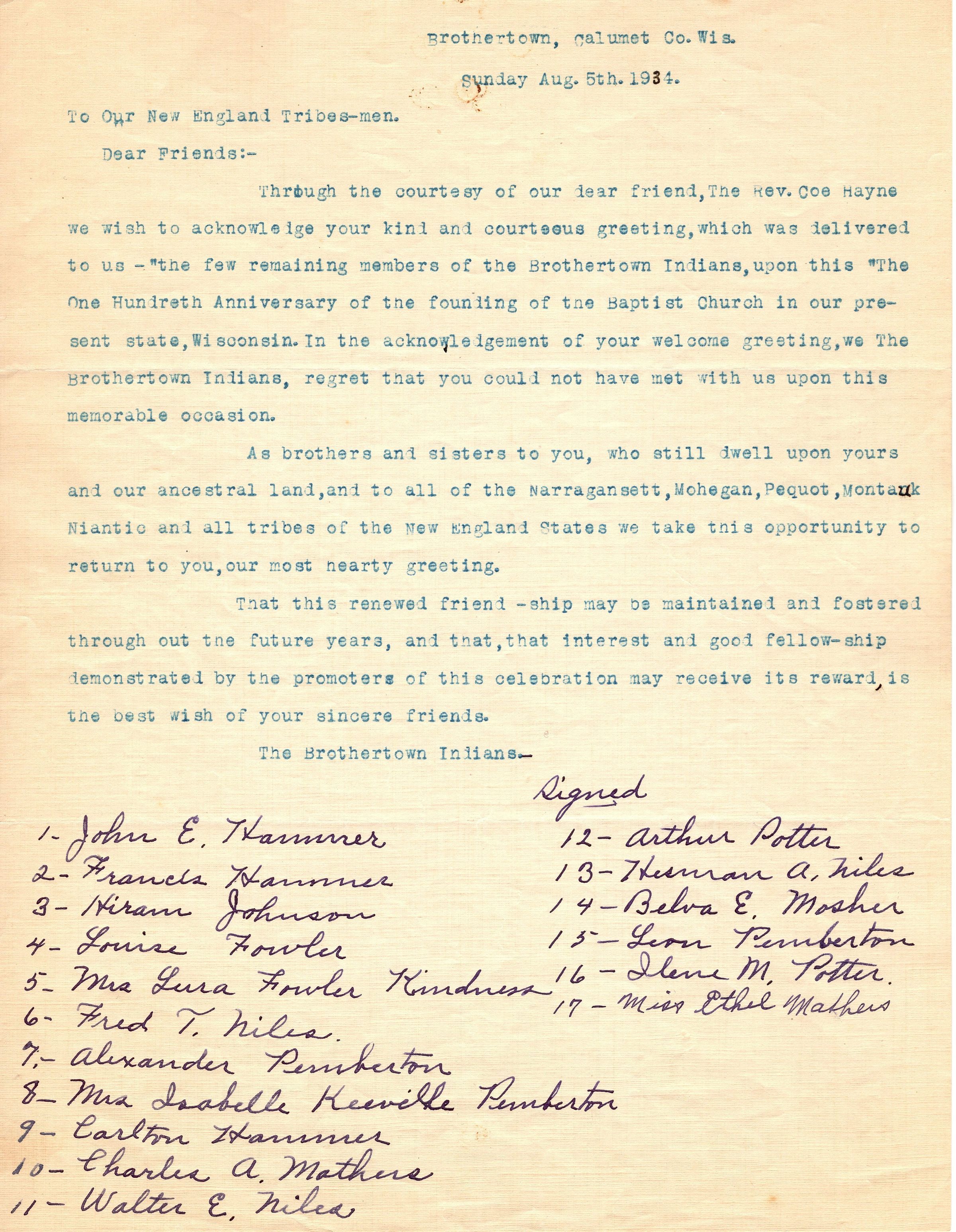 Single page, typed correspondence addressed "Brothertown, CAlumet Co. Wis, Sunday Aug. 5th. 1934, To Our New England Tribes-men. Dear Friends..." It acknowledges a previous letter and the regret that the New England tribes could not be there (Brothertown, WI) to celebrate the 100th anniversary of the founding of the Baptist Church in WI. It ends with grateful thoughts of a renewed friendship between Brothertown,. Narragansett, Mohegan, Pequot, Montauk, and Niantic tribes and is signed by 17 members of the Brothertown Indians. These are not original signatures, I think this is a copy of the original letter with a handwritten list of who signed the original.