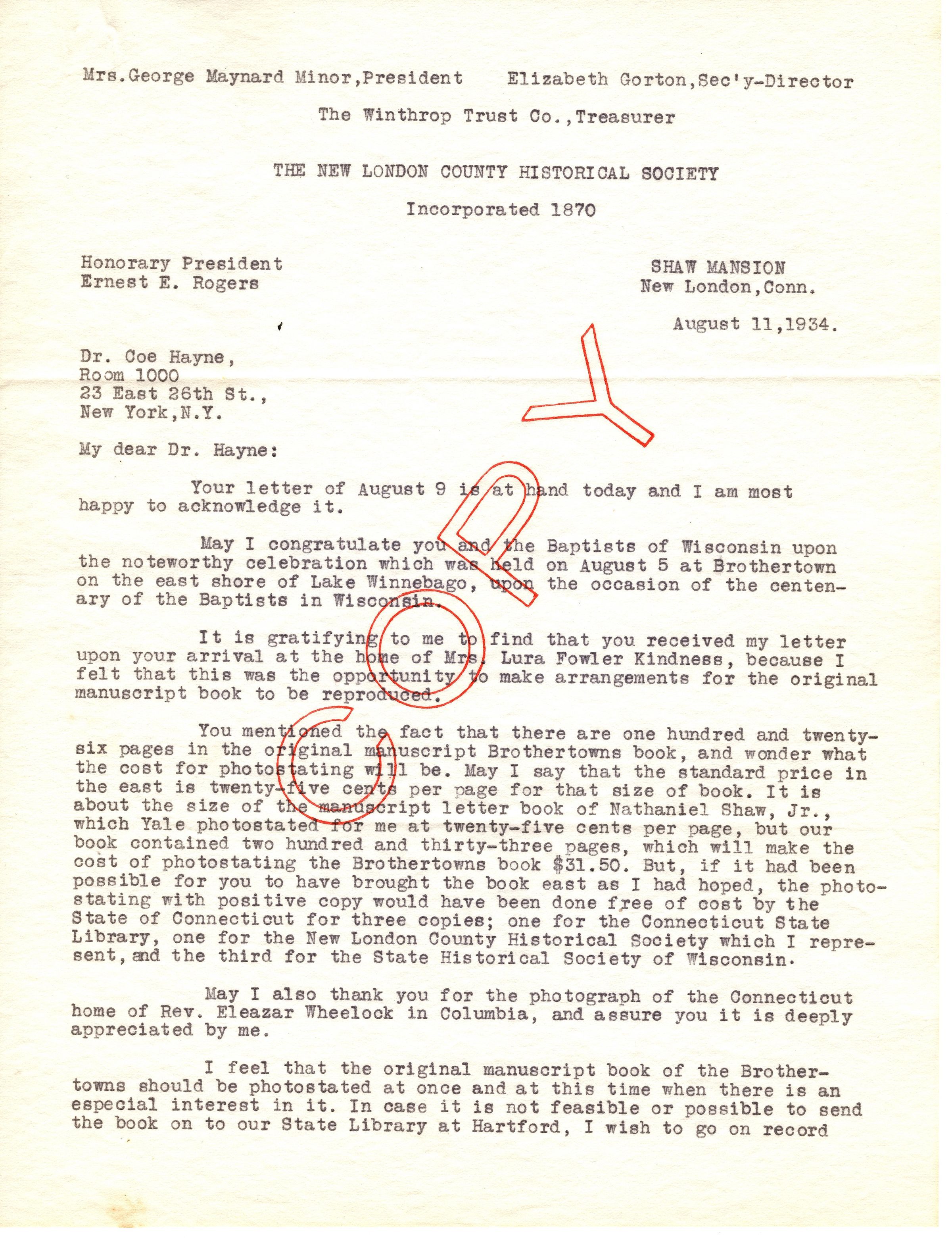 Two page, typed correspondence on New London County Historical Society letterhead, addressed "August 11, 1934, Dr. Coe Hayne, Room 1000, 23 East 26th St., New York, N.Y., My dear Dr. Hayne". The letter congratulates the pilgrimage at Brothertown by the Baptist church and talks about photocopying the pages from the Brothertowns book. A copy of this letter was sent to the State Historical Society of Wisconsin because it mentions them doing the photostating (copying the manuscript). It is signed "Very cordially yours, (signed) Ernest E. Rogers". This is a copy of the original letter and has COPY in red ink across both pages.