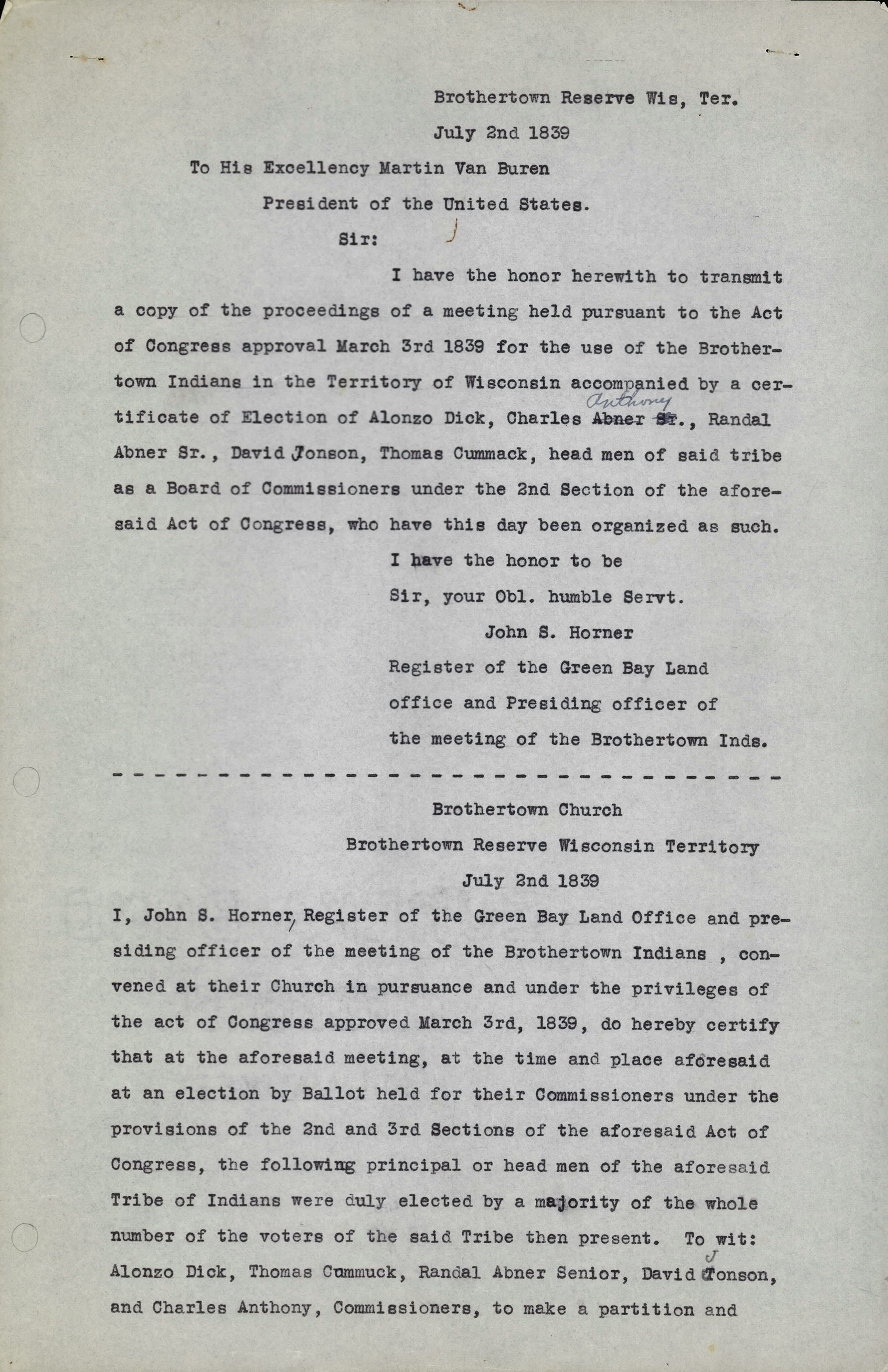 10 pages of typed correspondence between President Martin Van Buren and the Register of Green Bay Land, John S Horner regarding the land divided amongst the Brothertown in Wisconsin after the 1839 act. Charles Anthony, Alonzo D. Dick, Randal Abner Sr., Thomas Commuck, and David Johnson also submitted information for this document as well. Each page is numbered in the middle of the top margin. It appears to track the land being divided and on the last page returns the patent for a John Kiness who does not exist.Collection