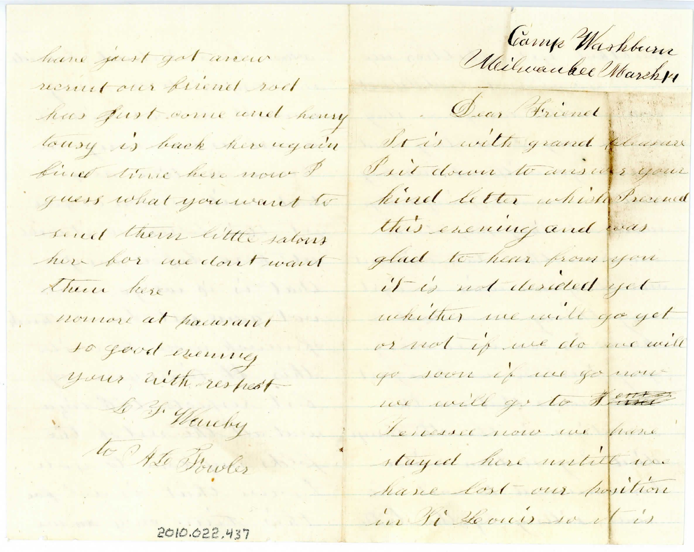 Small piece of paper folded in half to create four pages of correspondence. The first page is addressed "Camp Washburn, Milwaukee March 14, Dear friend". It talks about the company not knowing if they are going to go or not and that the writer is being expected to go without pay. It tells of one soldier just falling dead in camp while this letter is being written. Signed "your with respect L.G. Wauby to A. L. Fowler".Collection