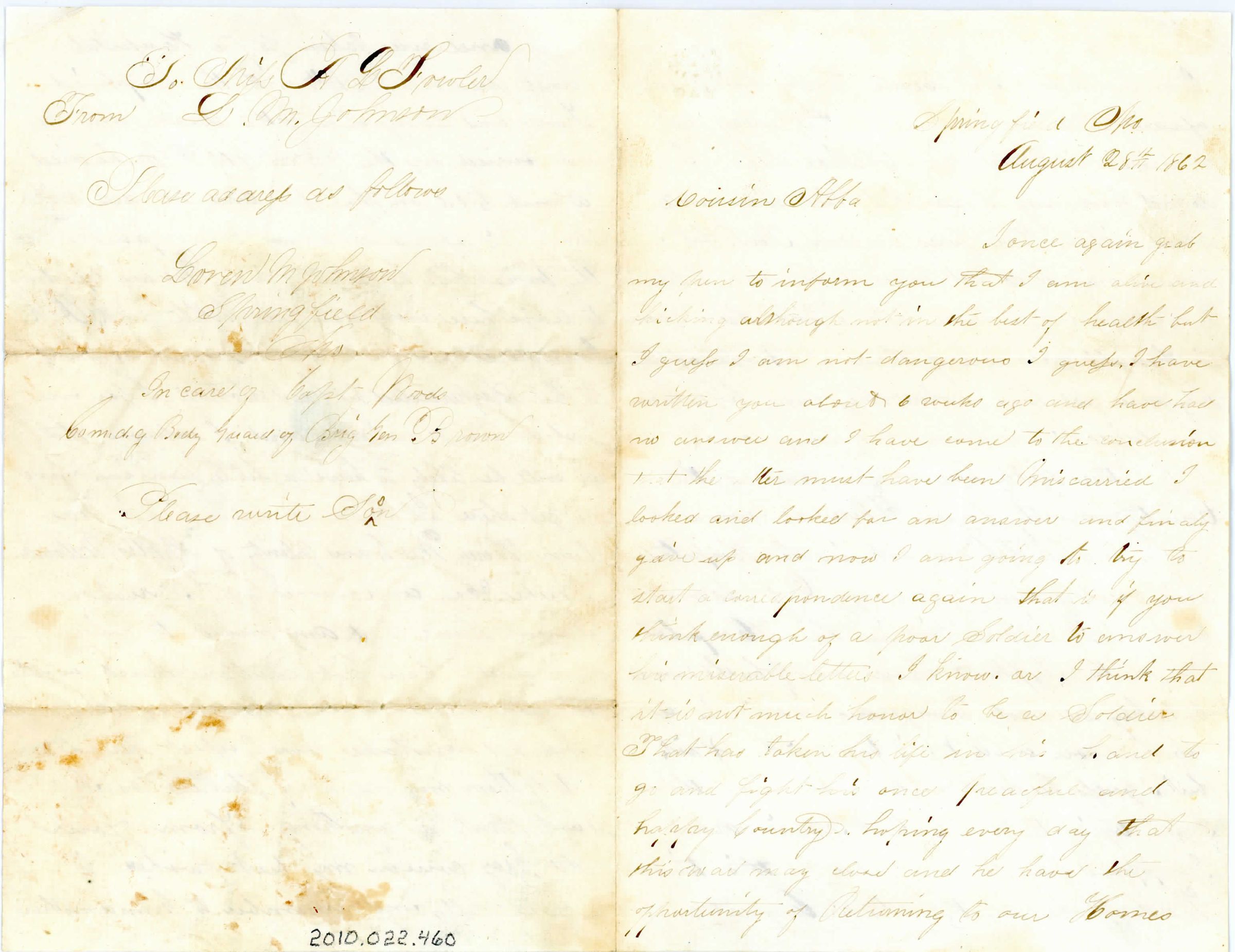 Single sheet of paper folded in half to create four pages of correspondence. There is a stamp in the top left corner of the first page of a floral design with "O&H" below it. The letter is addressed "Springfield, Mo, August 28th 1862. Cousin Abba..." and signed "To Mifs A. L. Fowler. From L. M. Johnson. Please address as follows: Loren M. Johnson, Springfield, Mo. In care of Capt Woods. Comdg. Body Guard of Brig Gen. Brown. Please write soon". It talks about his health and the war.Collection