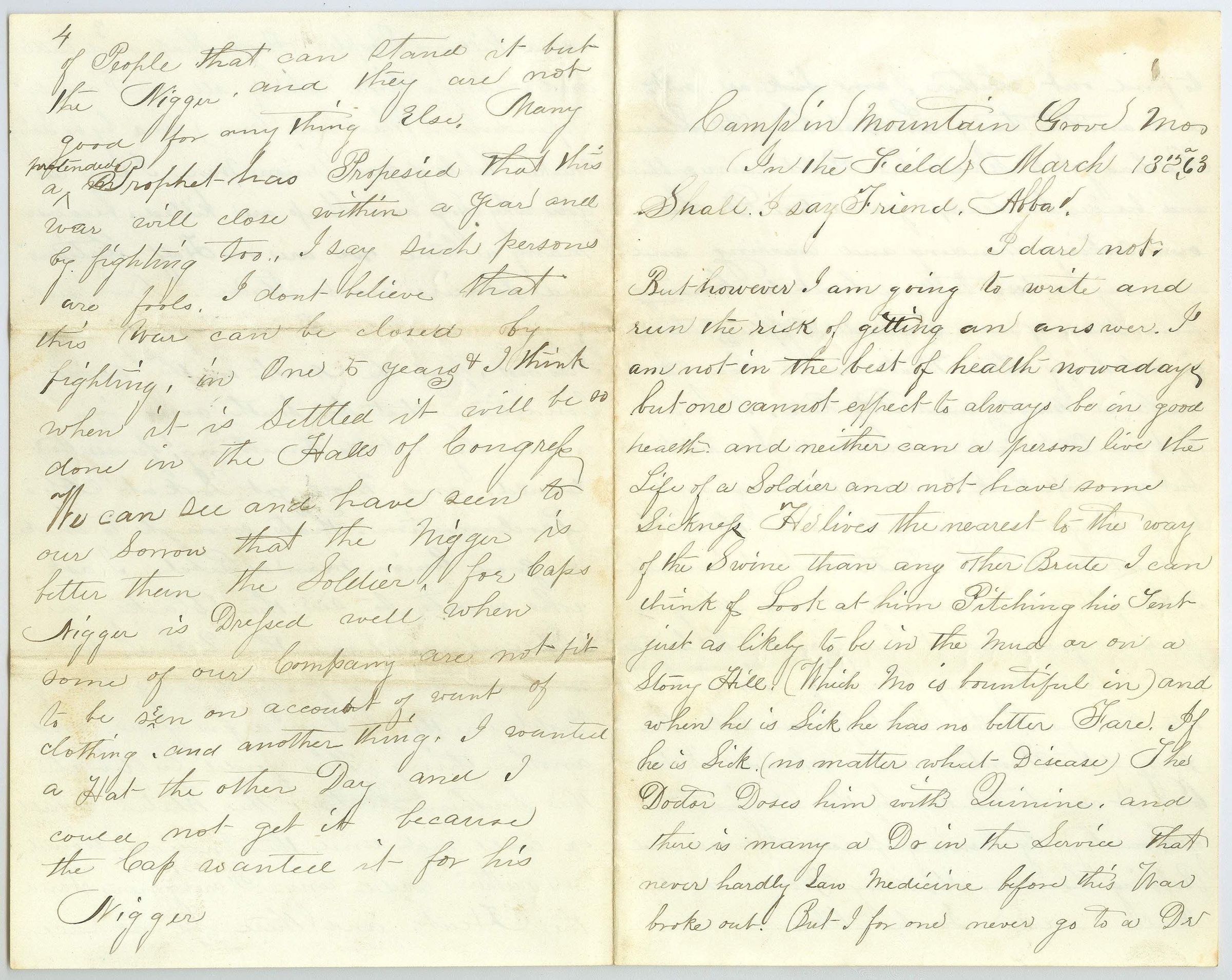 Two folded sheets of paper create eight pages of correspondence. They are written so that when folded the first page is on top, second inside as you open the folded paper, third opposite second, fourth on back of the third page (opposite of first page unfolded). Same is true with pages five through eight. The letter is addressed "Camp in Mountain Grove Mos. In the Field, March 13, 63. Shall I say Friend, Abba, I dare not." And it is signed "From your friend and well wisher, L. M. Johnson. Write soon to Miss. A. L. Fowler. Address L.M. Johnson, Co. A. 2nd Wis Cav. 1st Brigade 3rd Division, Army of the Frontier, Via Rolla Mo". The letter is a complaint about the war and the conditions for the soldiers. No pay, bad food, poor clothing. The writer believes he, as a soldier, is worse off than the black people they are fighting to free and that the war will not be won on the field but in Congress. He talks about desertion, unsure who did or if he is just thinking about it.Collection