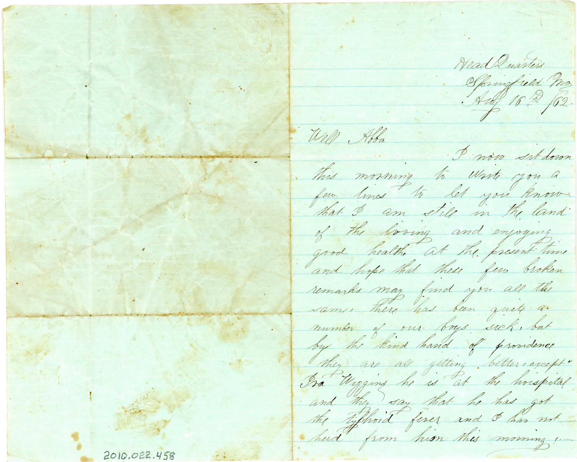 Single sheet of paper, folded to make four pages of correspondence. Writing only on first page and second page. The paper is a green color with blue lines. The letter is addressed "Head Quarters, Springfield Mo, Aug 16th /62. Well Abba" and signed "from your well wishes, S. Skeesucks. Direct Springfield Mo. In care of Capt Wm Woods, Comdg Body Guard Brig Genl Brown".There is a faint stamp in the top left corner of the first page (mirror image when paper is unfolded in the center) that is oval in shape with a seal in the center of a castle with a crown on the top and "Hyperion Tint" above and below the castle and crown. The content of the letter includes the sickness of the soldiers but most are on the mend except one with typhoid. The soldier heard they were going to draft from WI and that many are running away to Canada to avoid the draft.Collection
