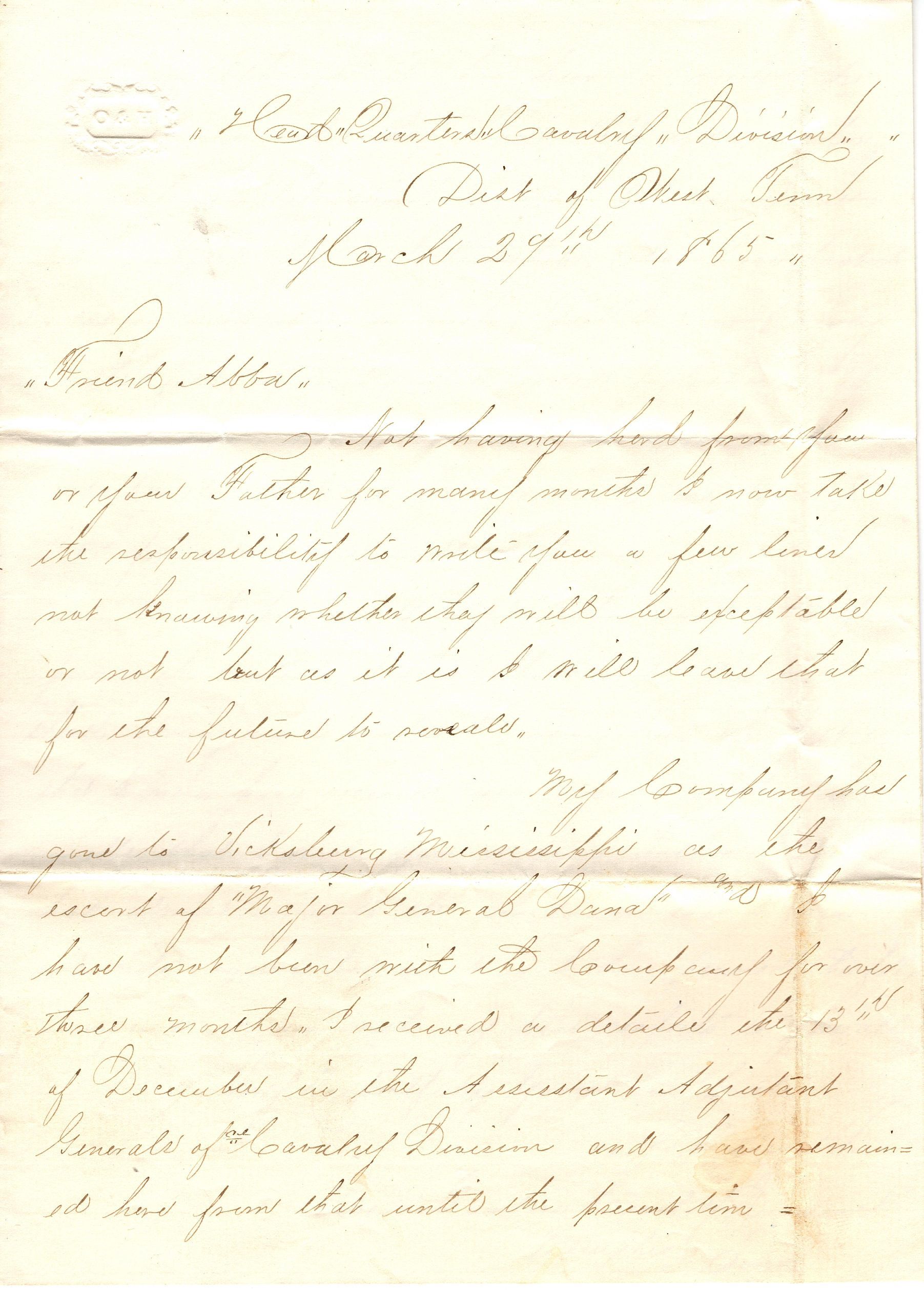 Two pages of correspondence on a single sheet of paper folded making four pages total. The second and fourth page are blank, or if sheet is unfolded, writing is only on one half of each side of the paper. The first page has a stamp int he top right corner with "P&H" in the middle of a decorative circle. The letter is addressed "Head Quarters Cavalry Division, Dist of West Tenn, March 29th 1865, Friend Abba" and is signed on the third page "Very Respectfully Yours in haste, S. Skeesuck, Head Quarters Cavalry Division, Memphis Tenn." This letter is not in reply to a letter because he never received one. It talks about the company going to Vicksburg Mississippi with Major General Dana, but the writer didn't go because he received a detail to remain there as an Assistant Adjutant. The writer is unsure why they keep him there because he is not qualified to be a clerk.Collection