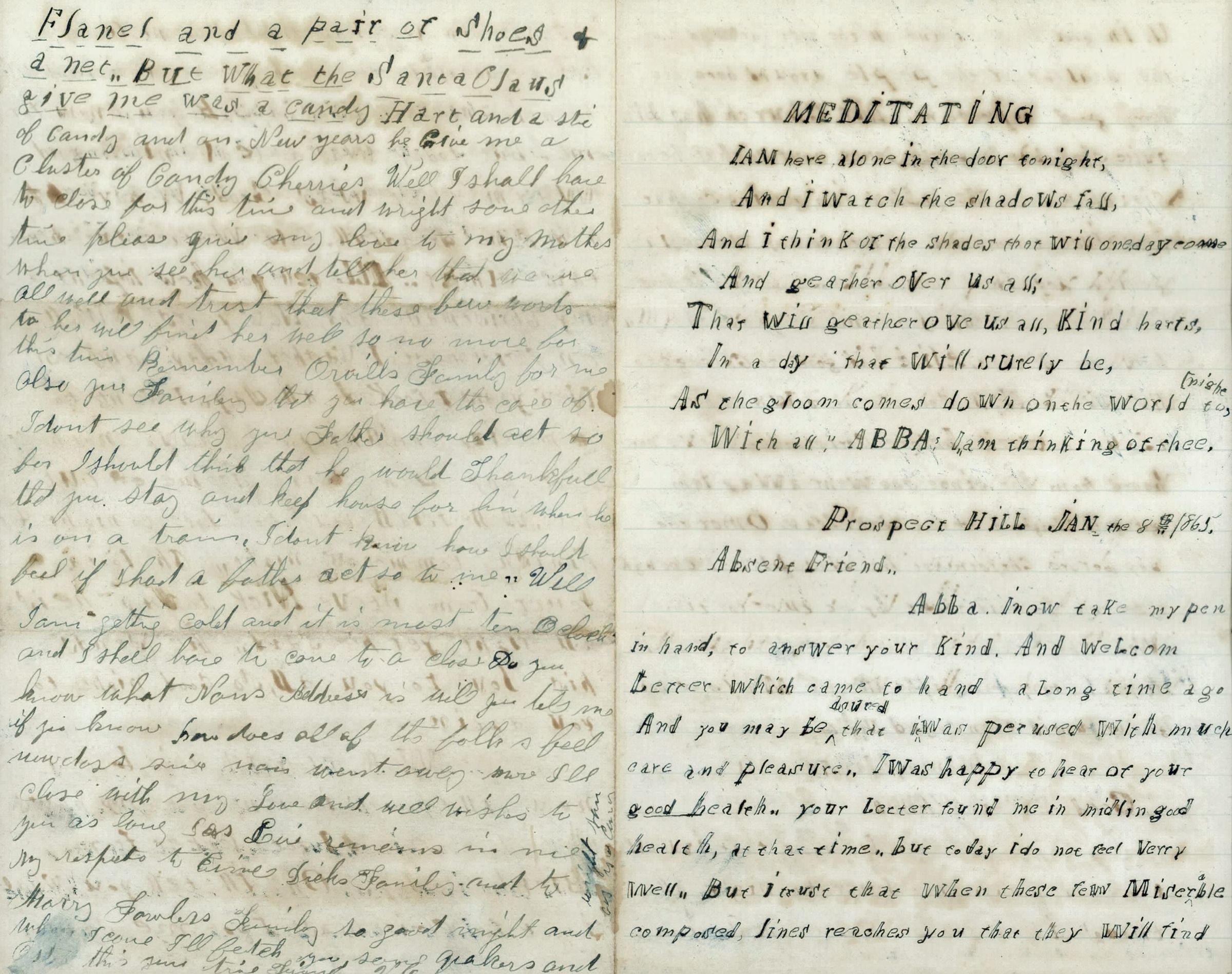 Four page correspondence on a single sheet of folded paper. Most of the letter is written in uncial (block letters, or non-cursive). The letter has a poem at the top called "Meditating". It is addressed "Prospect Hill Jan. the 8th 1865, Absent Friend, Abba". The first letter ends on the second page and just talks about what's going on around town. The second letter starts "Monday Jan. 9th 1865, Good Evening Abba". It is a continuation because she wasn't feeling well, but doesn't feel much better the next day. The second letter talks about what she got for Christmas and the fourth page changes from the blocked letters to cursive. Unsure who wrote this, it looks like just initials at the very bottom of the last page "V. C." perhaps. Could be male too.Collection