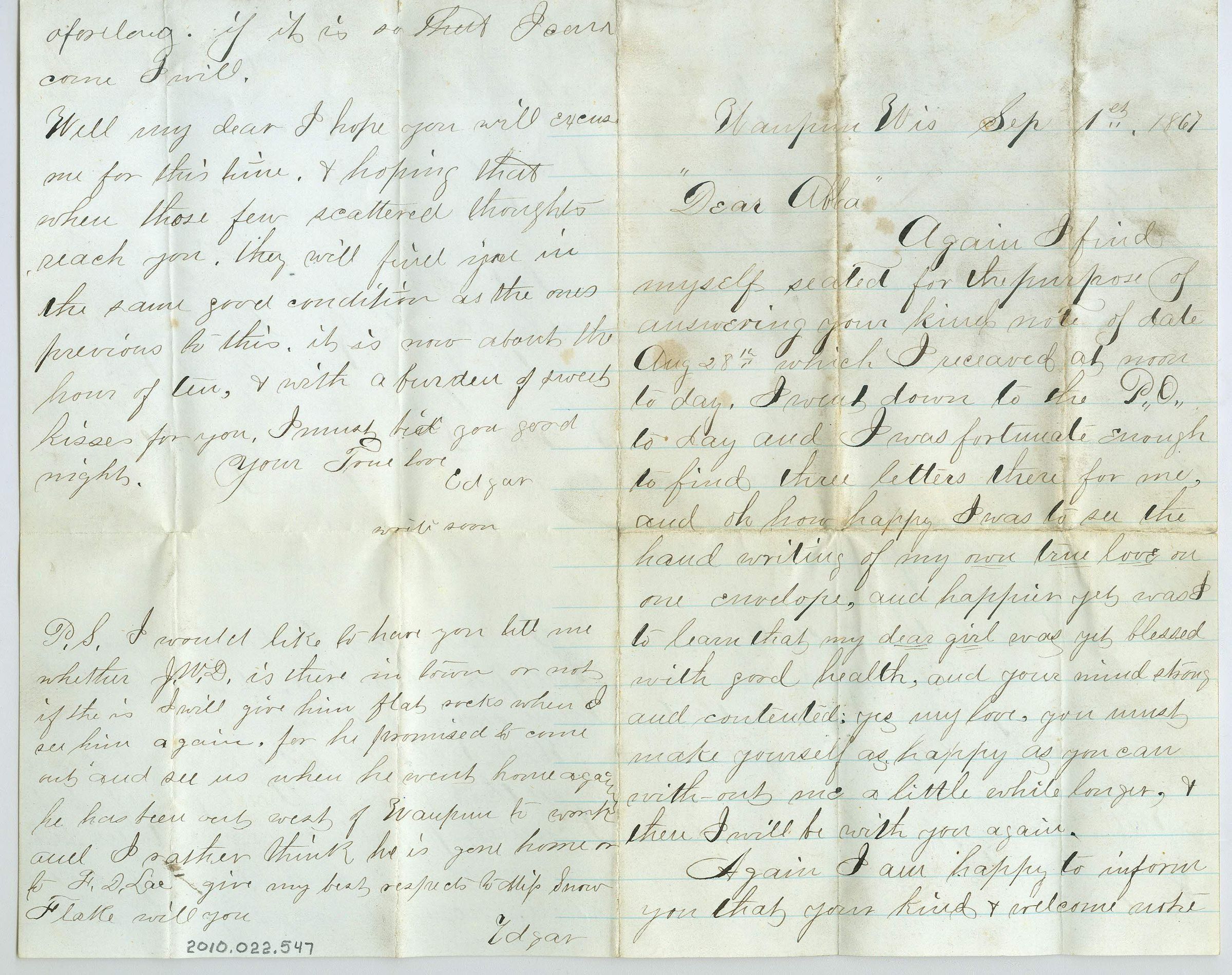 Four page correspondence on a single sheet of paper, folded. The letter starts "Waupun Wis, Sep 1st 1867, Dear Abba" and is signed on the fourth page (opposite the first page) " Your true love Edgar, write soon" with a "P.S. I would like to have you tell me whether J.W.D. is there in town or not...." and signed Edgar again at the very bottom. Most of the letter is in response to what was written by the receiver of this letter.Collection