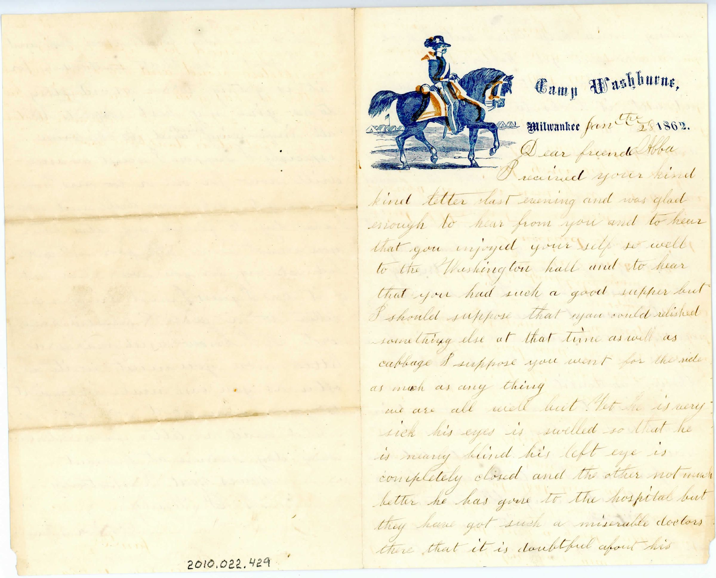 Single sheet of paper, folded in half to create four pages of correspondence. The first page has a stamp along the top of a man riding a horse and "Camp Washburne, Milwaukee, 1862." It is addressed "Jan the 28, Dear friend Abba". It talks about the soldiers, one has a bad disease in his eyes, the "boys" want to go home but can't get a furlough until their captain gets more men to replace them. They thought they would be able to go home last week but can't for at least another month. Signed "yours most respectfully, H. F. Wauby". The last page is blank. There is a stamp in the top left corner of the first page that goes through to the top right corner of the last page (both stamps face each other in the middle of the unfolded sheet). It is of a rounded triangle with flourishes.Collection