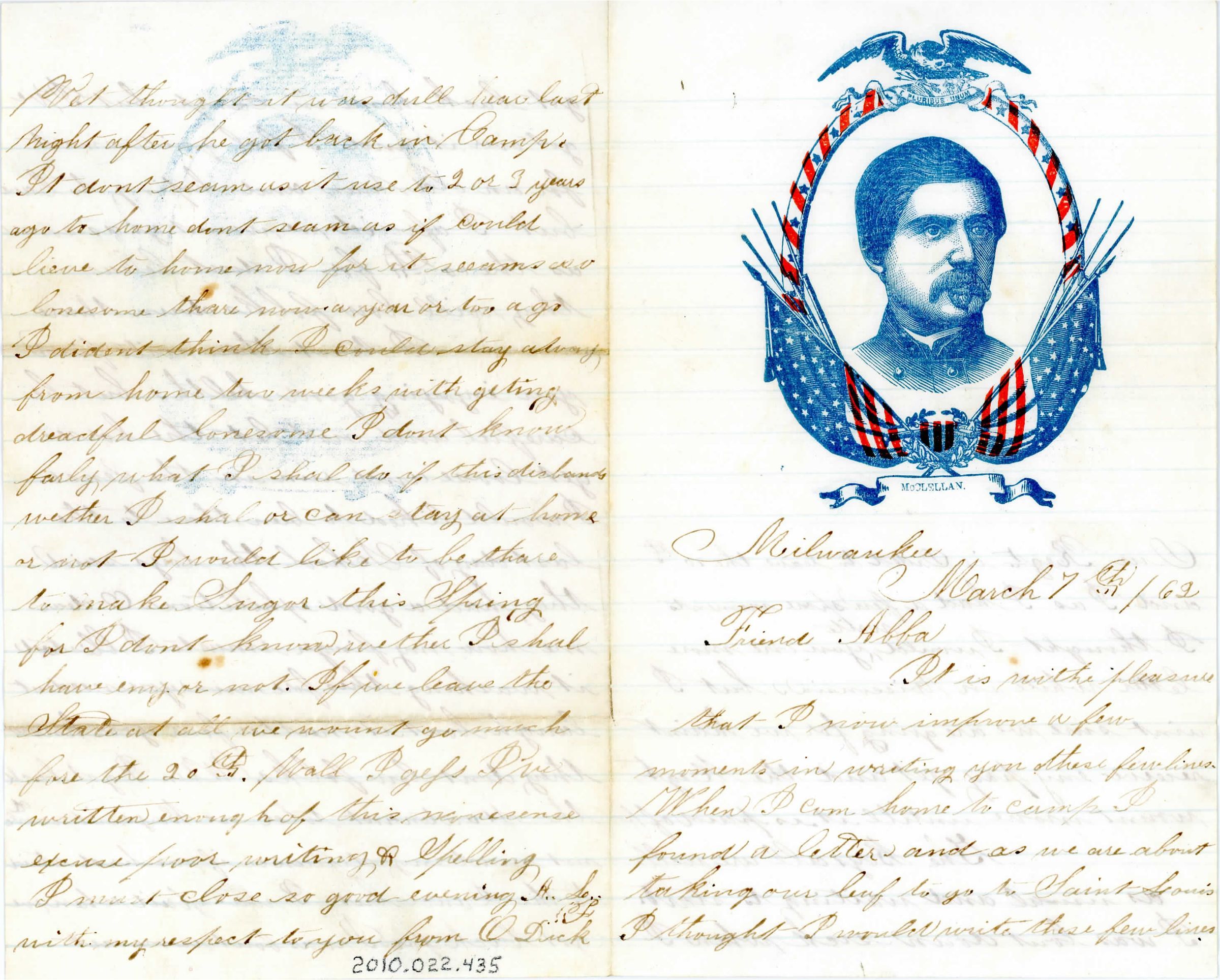 Single sheet of paper folded in half to create four pages of correspondence. There is a large stamp on the first page at the top in red and blue of a man (McClellan) encircled in US flags and starred banners with an eagle at the top and "E Pluribus Unum". It is addressed "Milwaukee March 7th /62, Friend Abba" and is signed "from O. Dick". He is writing one last time while in Wisconsin because the regiment is suppose to move, but wont until they get paid.Collection