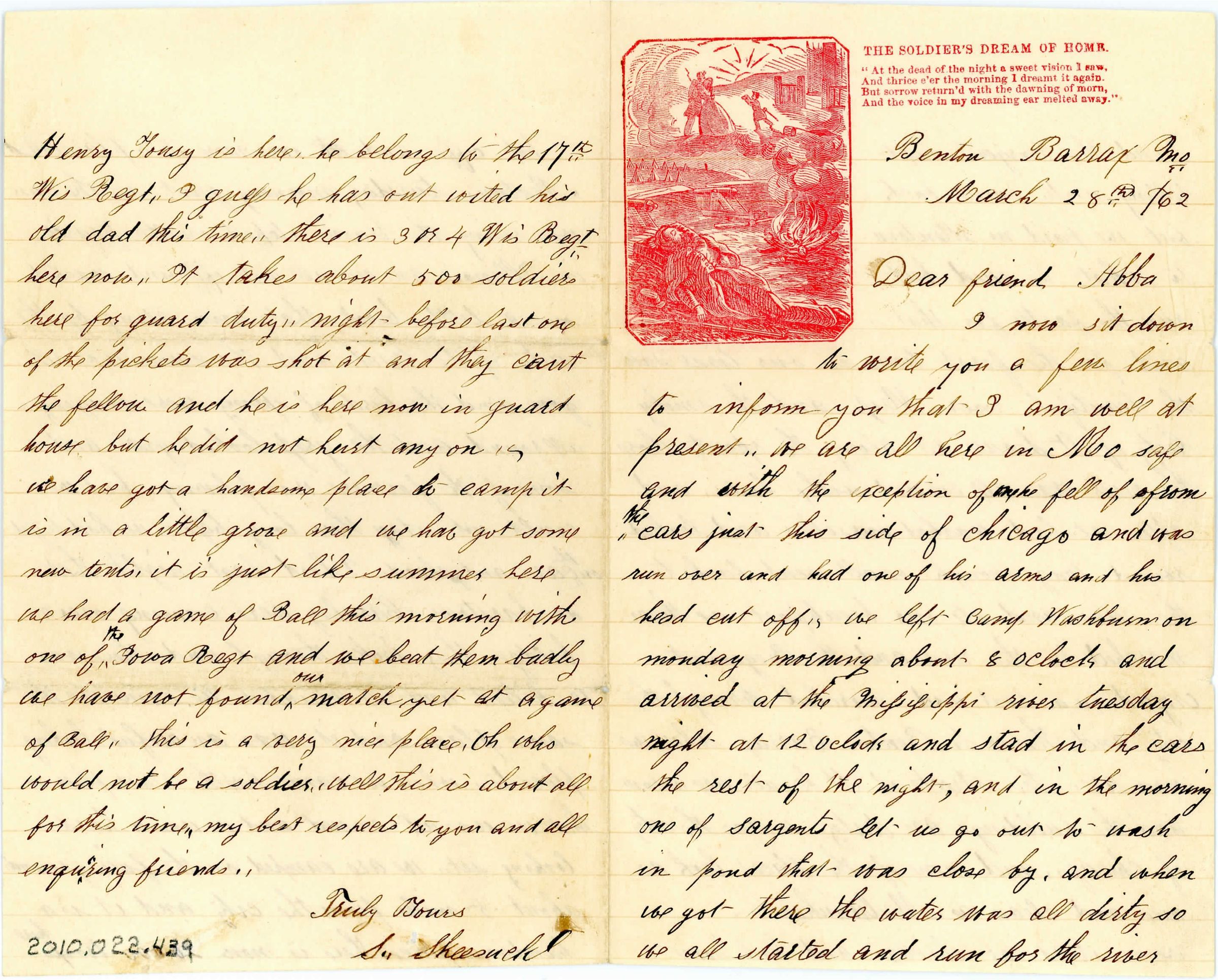Single sheet of paper, folded in half to create four pages of correspondence. The top of the first page has a stamp in red ink that is of a man sleeping in the foreground near a fire, dreaming of a couple kissing. There are tents in the background. Next to the picture is "The Soldier's Dream of Home. 'At the dead of the night a sweet vision I saw, And thrice e'er the morning I dreamt it again. But sorrow return'd with the dawning of morn, And the voice in my dreaming ear melted away'." The letter is addressed "Benton Barrax, Mo. March 28th /62. Dear friend Abba" signed "Truly yours S. Skeesuck". It talks about the companies travels through Chicago, across the Mississippi River, and to St. Louis.Collection
