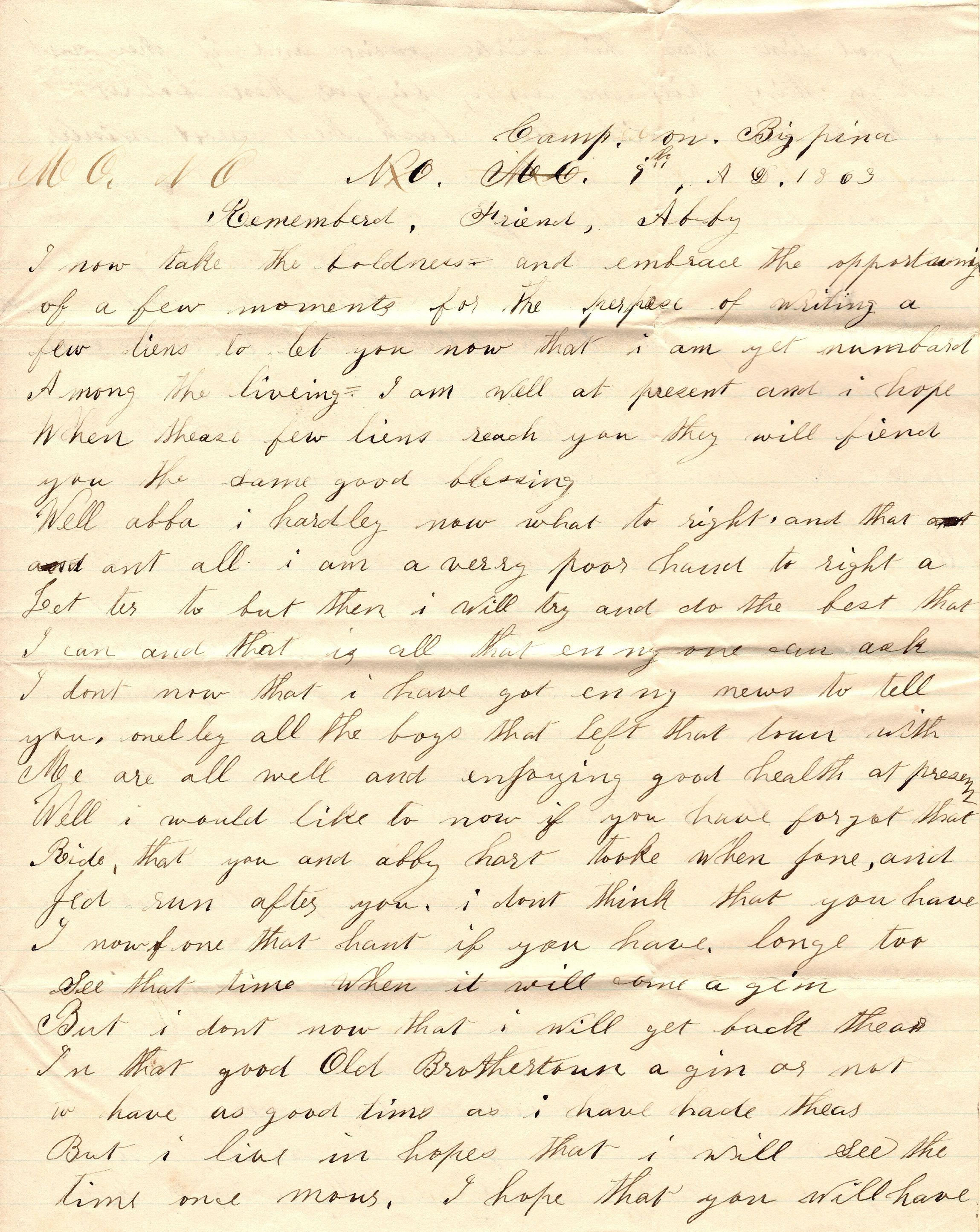 Four page letter addressed "Camp on Big Pina -- -- 9th AD 1863. Remembered Friend, Abby" signed "W. H. Johnson". The writing is dark on the first page but gets faint on pages two and three, starting after the third line on page two. The paper is full sized and there are two pages connected together. Hard to read what it is about.Collection
