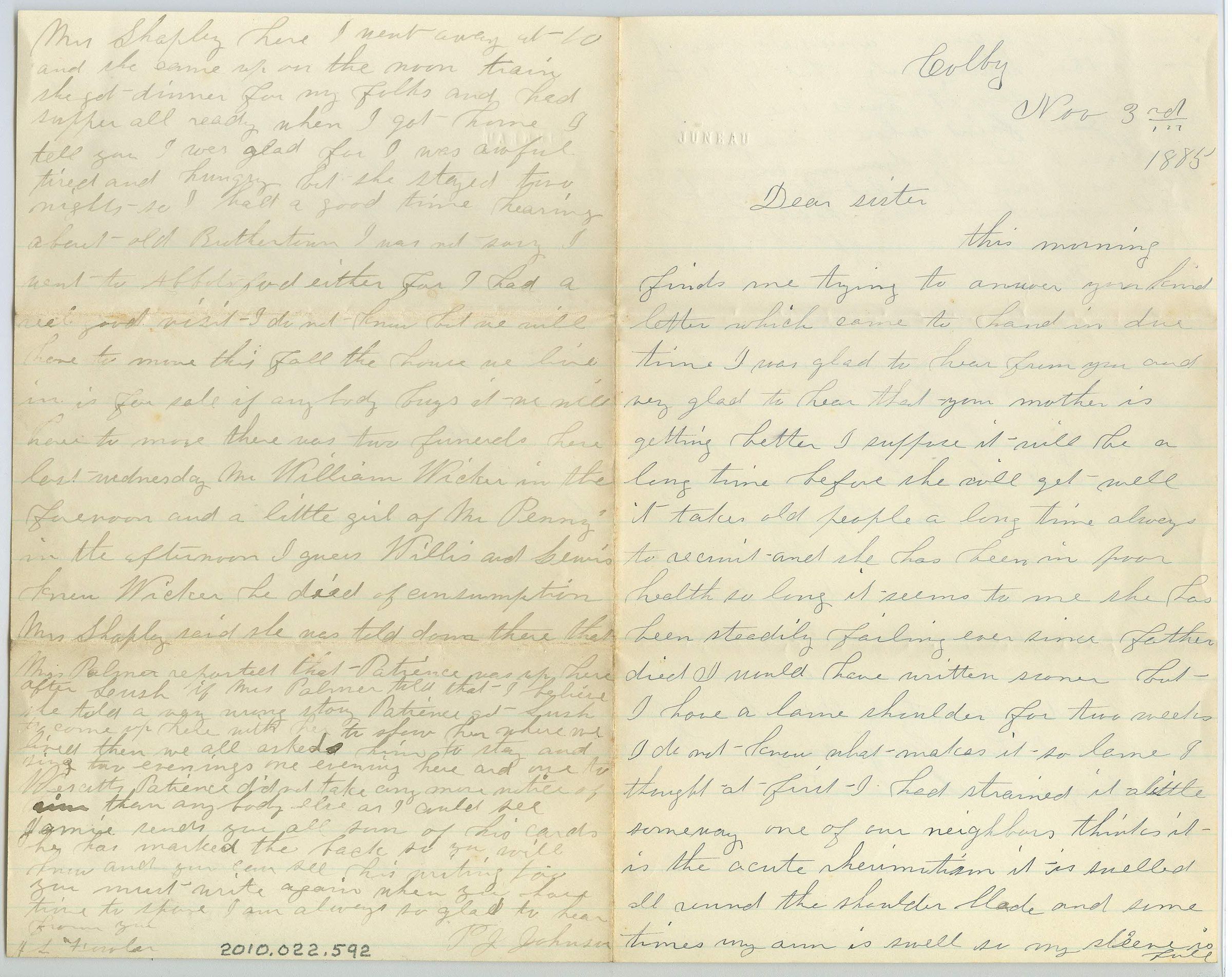 Four pages of correspondence written on a single sheet of paper folded in half and lined. The letter is addressed "Colby Nov 3rd 1885, Dear sister" and signed faintly on the fourth page P.J. Johnson. It looks like H.S. Fowler is written in the bottom left corner of the last page. The ink must have run out at the bottom of the second page and the writer looks to have changed pens to a lighter black ink for the third and fourth page. The writing gets really crunched on the bottom of the fourth page as the writer begins to run out of room.