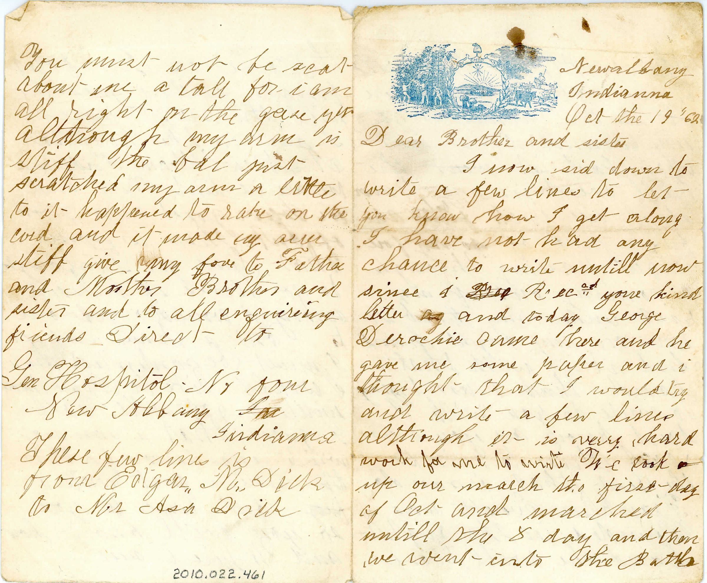 Single sheet of paper folded in half to create four pages of correspondence. Blue ink stamp in the top left corner of the first page of a farm scene with a circle in the center of a distance shot of land and "Ohio" above the circle. The letter is addressed "Newalbany, Indianna [sic], Oct the 19 "62. Dear Brother and sister..." and signed "give my love to Father and Mother Brother and sister and to all enquiring [sic] friends. Direct to Gen Hospital No four New Albany, Indianna [sic]. These few lines is from Edgar M. Dick to Mr Asa Dick". The content of the letter includes how he got hurt at the Battle of Perryville. Shot in the hand that he usually writes with so hasn't been able to write for a while. The writer is reassuring his siblings not to worry about him because he is alright, just stiff.Collection