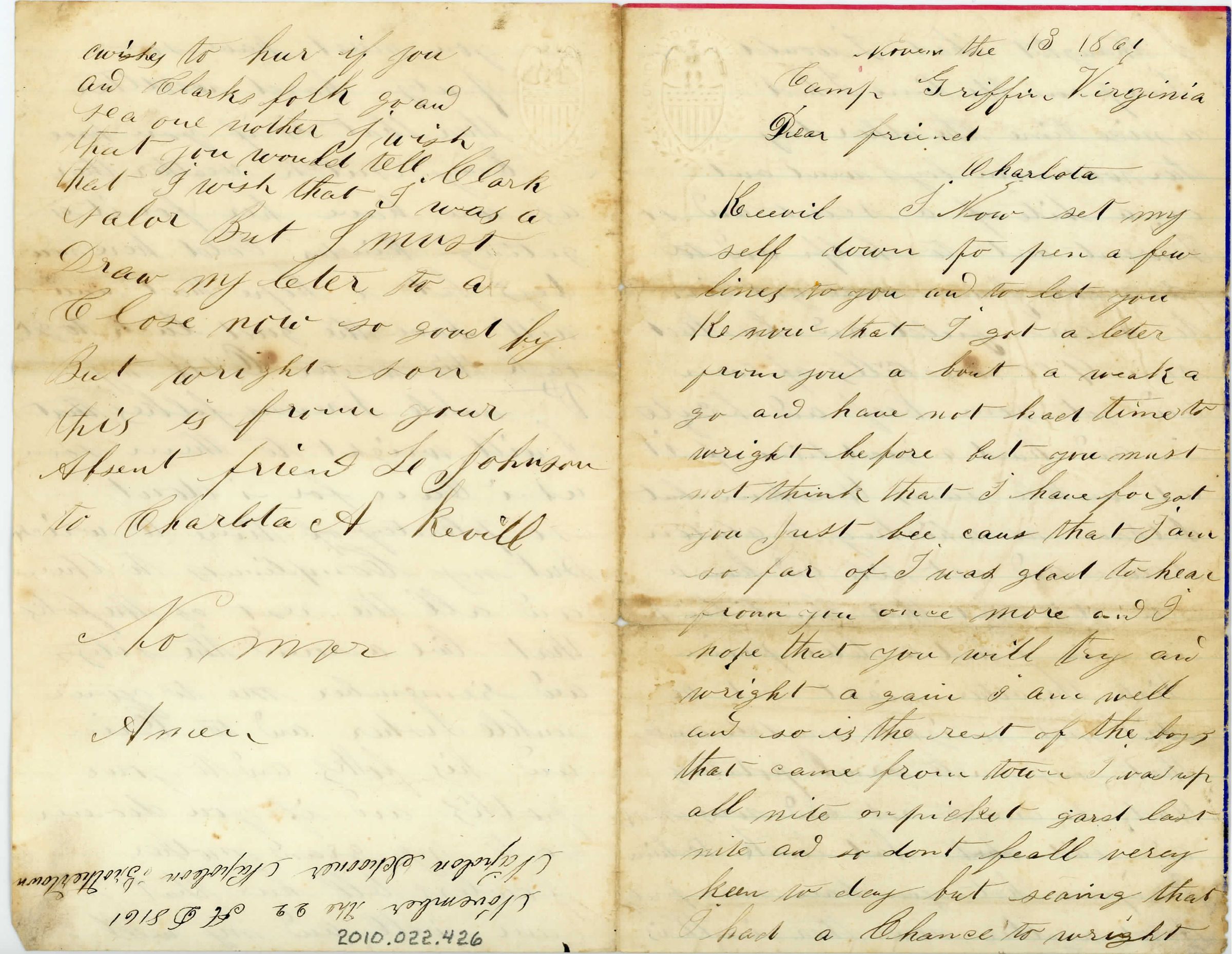 Single sheet of paper folded in half to create four pages of correspondence. The first page has a red border along the top and a blue border down the right edge. There is also a stamped seal in the top left corner of the first page that went through to the top right corner of the last page (so two stamps in the middle of the unfolded single sheet along the top edge). The seal is a "Union and Constitution" seal with an eagle on top and a flag below in an oval shape with a pointed bottom. There are two leaved branches along the bottom of the flag. The letter is addressed to "Novem the 13 1861. Camp Griffin Virginia, Dear Friend Charlota Keevil" from L. Johnson (grandson of a Fowler).Collection