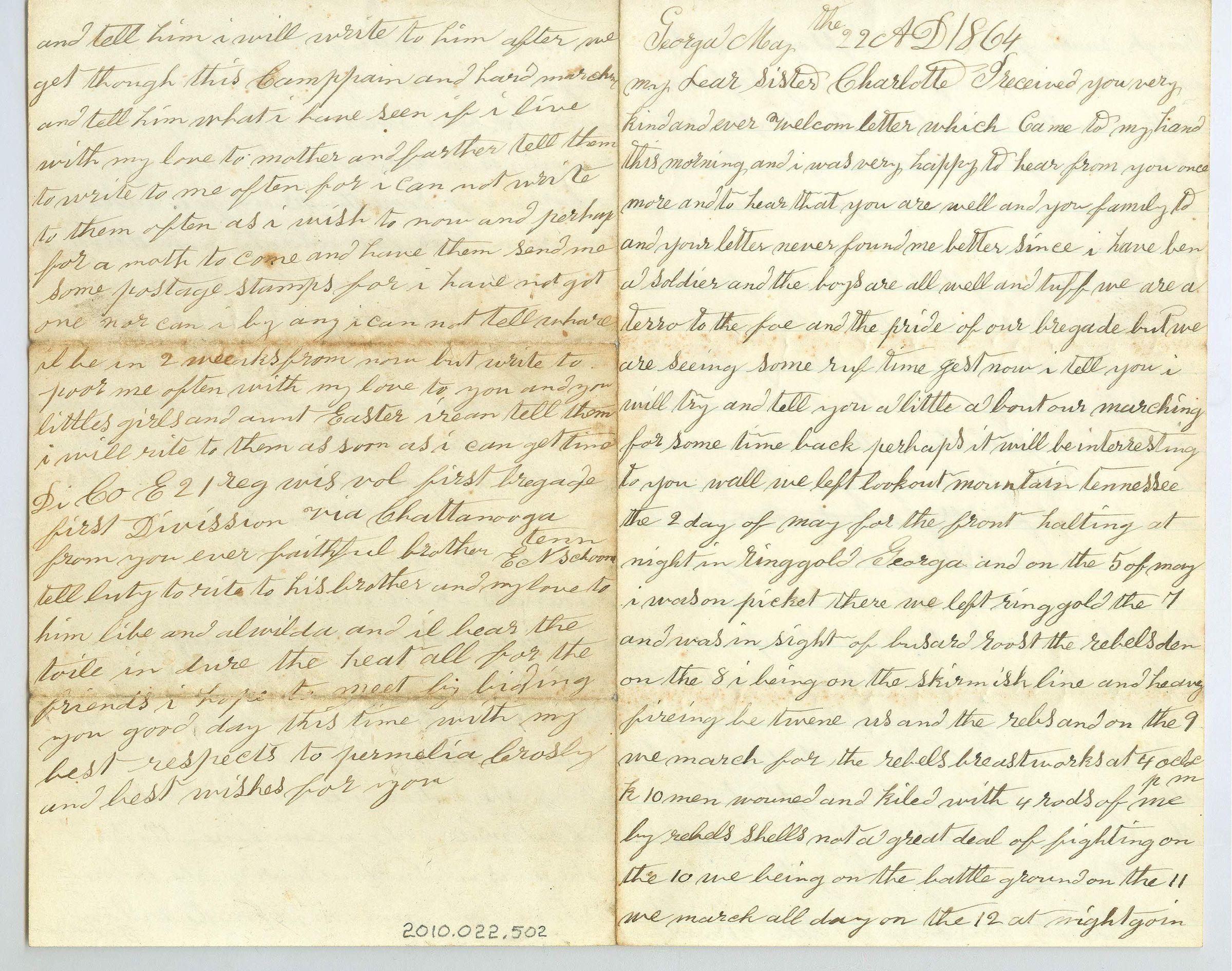 Four pages of correspondence on a single sheet of folded paper. The paper is cream in color and the ink is black. The letter is addressed "Georga, May the 22 AD1864, My Dear Sister Charlotte" and signed EN Schooner, but the signature is buried in the writing about 7 lines from the bottom of the last page. He continues his writing telling her to tell Luty to write his brother and send love to him and his best wishes to her. Writing is to each edge of every page and on page two he crunches a line at the very bottom.Collection
