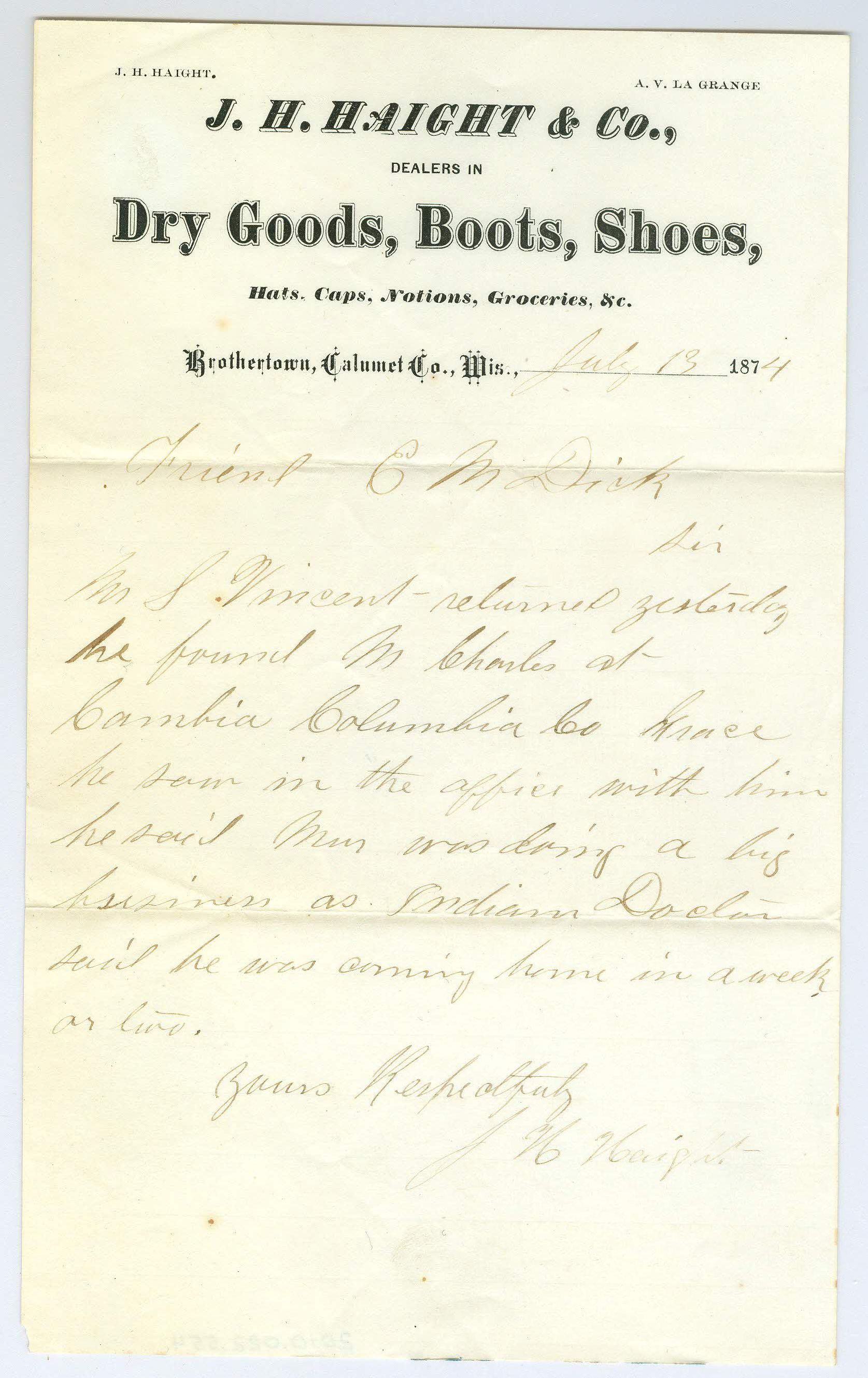 Single page correspondence written on letterhead. Letterhead reads "J.H. Haight. A.V. La Grange, J.H. Haight & Co., Dealers in Dry Goods, Boots, Shoes, Hats, Caps, Notions, Groceries, &c., Brothertown, Calumet Co., Wis, July 13, 1874" and is addressed to "Friend E.M. Dick" and is signed "Yours Respectfully, J.H. Haight". The letter talks about the return of S. Vincent soon who is doing well as an "Indian Doctor".Collection
